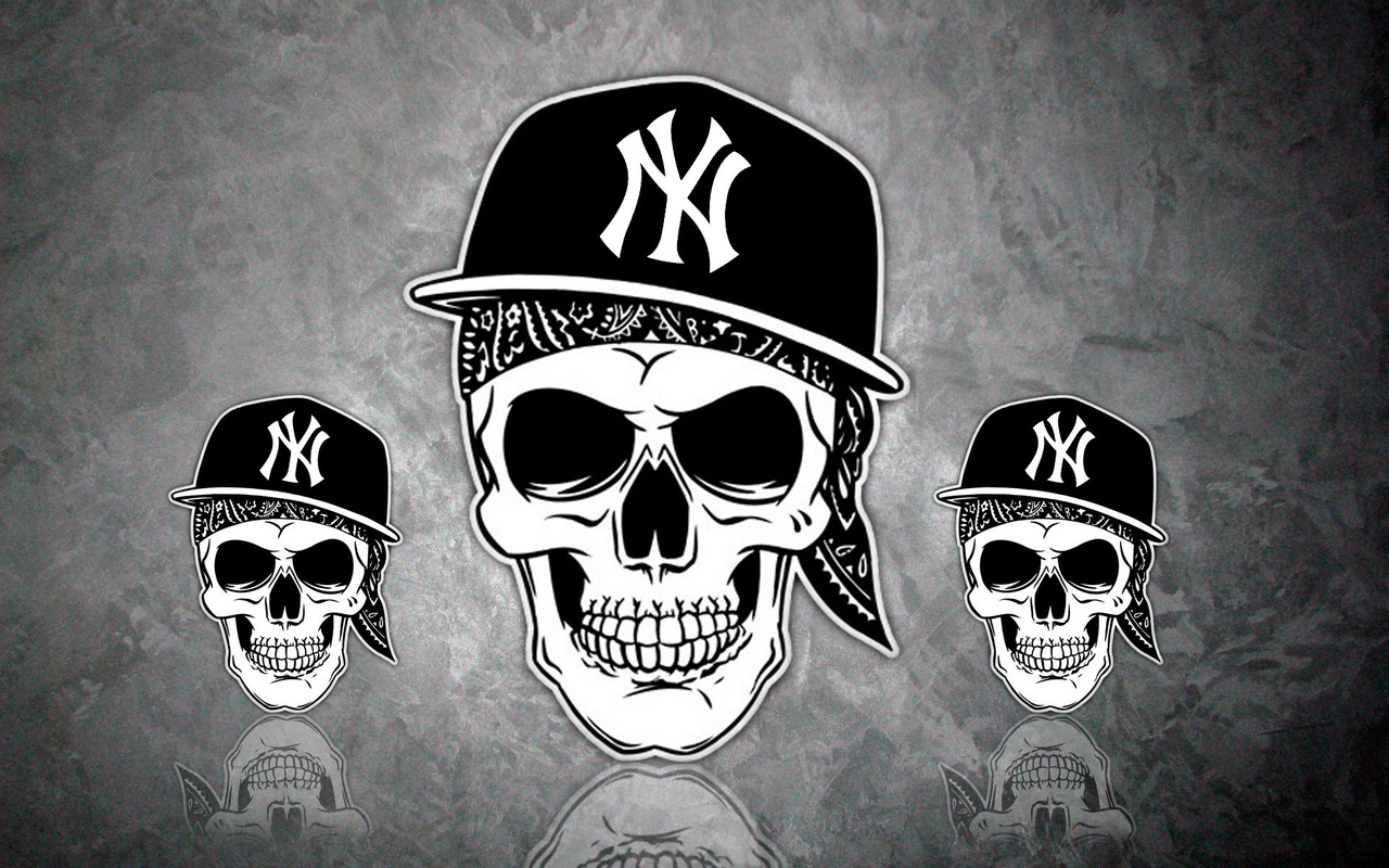 Description: Three skulls wearing baseball caps with the new york yankees on them.
