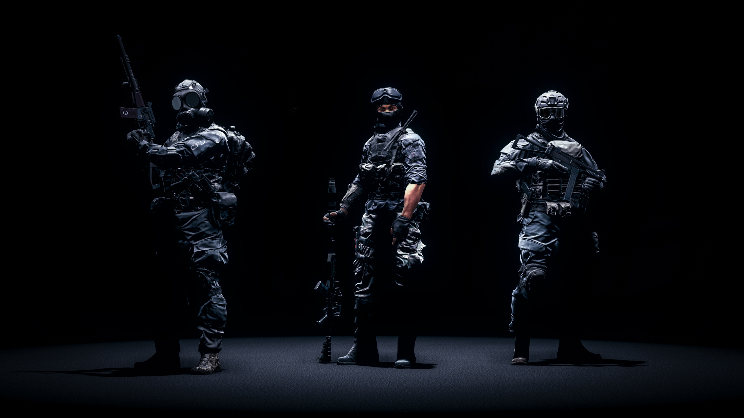 Description: Three soldiers in full body gear standing in the dark with guns in their hands and a gun in their hand.