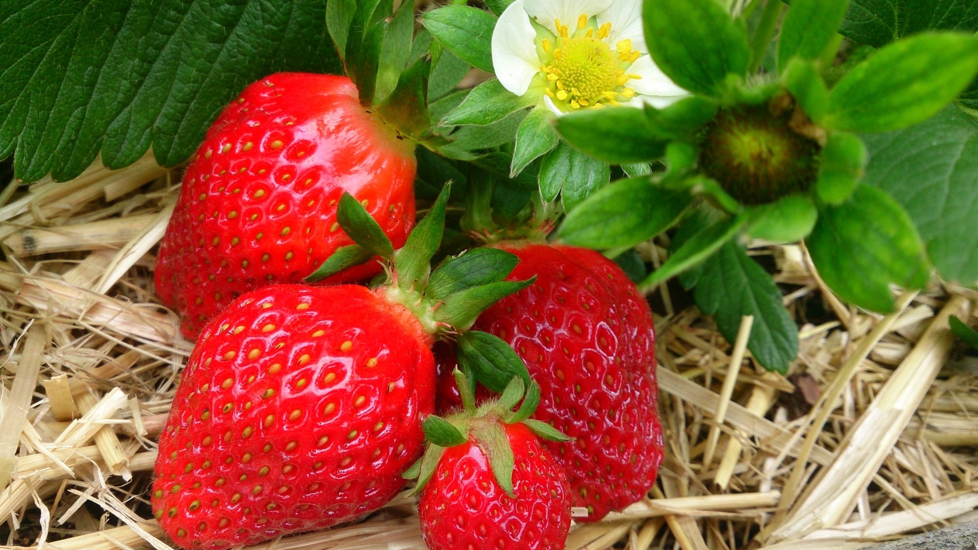 Description: Three strawberries are sitting on the ground next to a flower and a leafy plant with a white flower.
