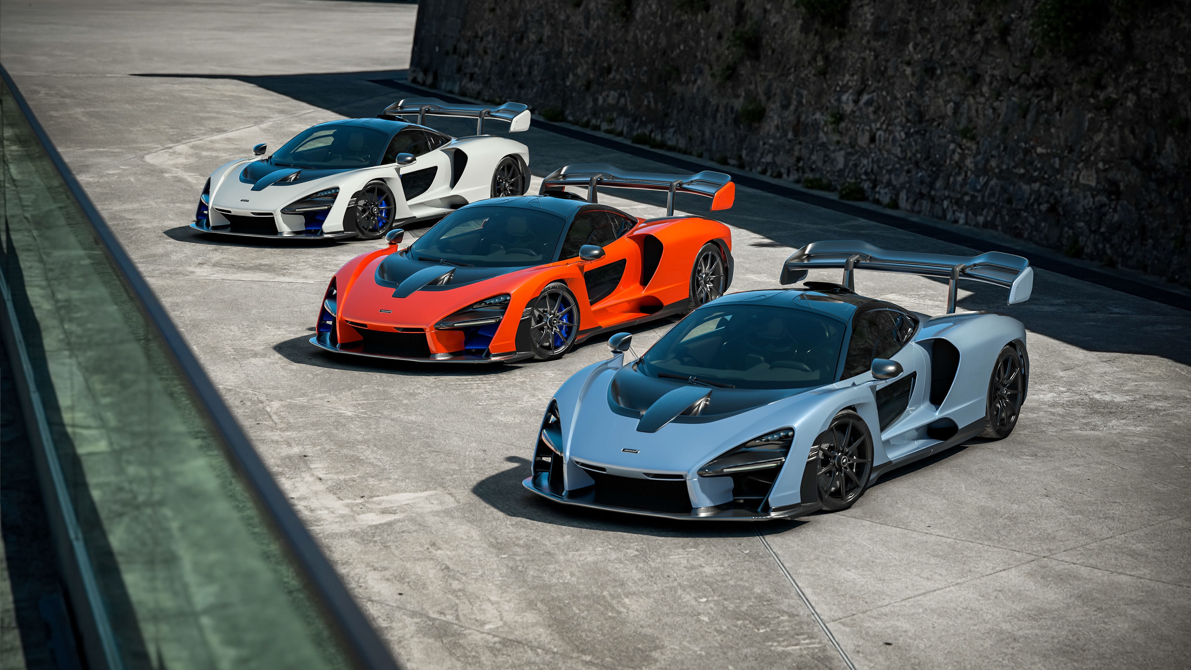 Description: Three supercars parked in a parking lot next to each other on a sunny day with a stone wall behind them.