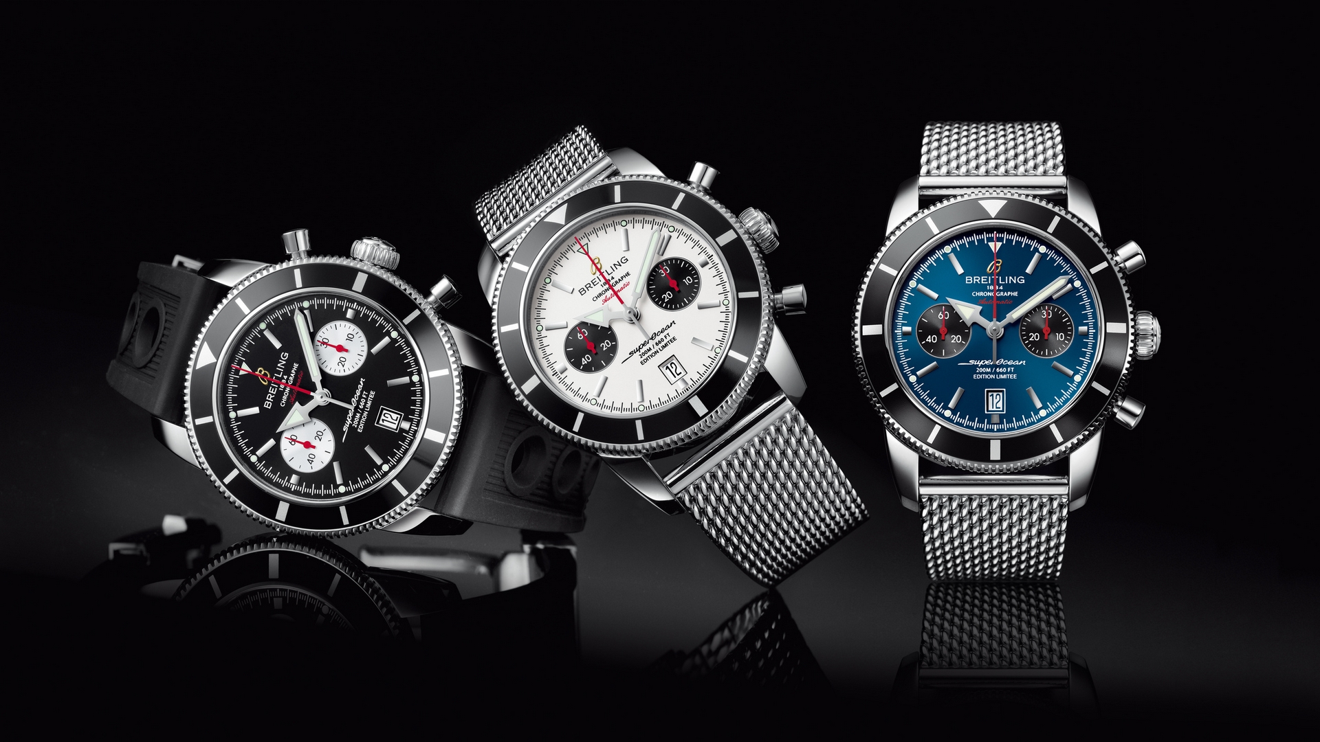 Description: Three watches are shown in a row on a black background with a reflection of the watch face and the watch face.