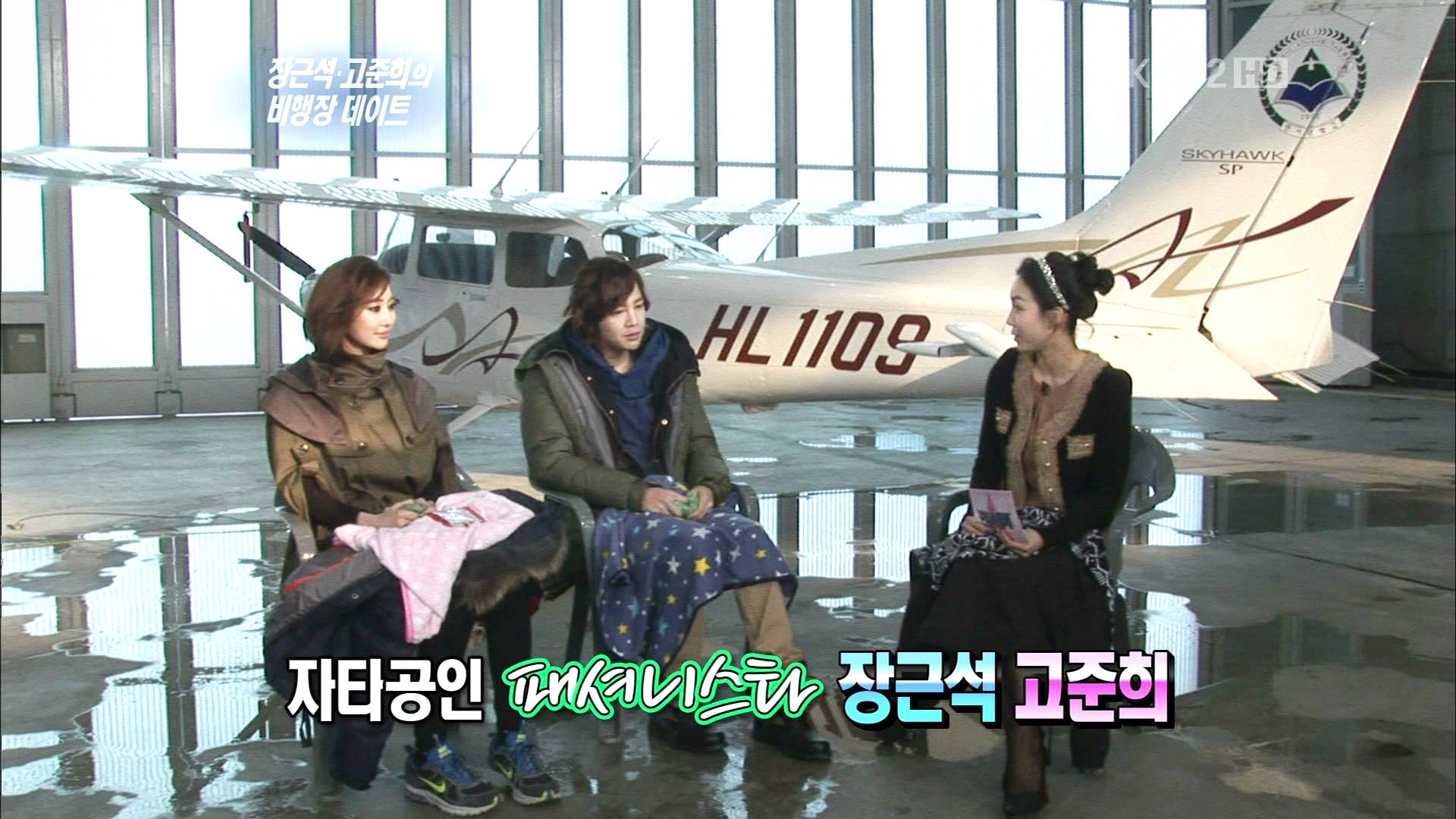 Description: Three women sitting on a bench in front of a plane in a hangar with a korean advertisement on the side.
