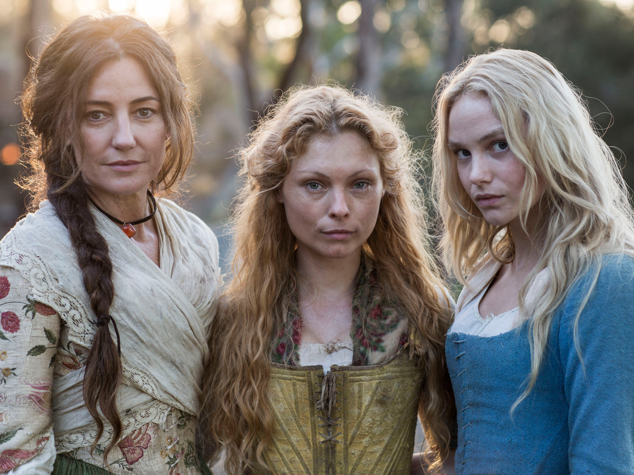 Description: Three women standing next to each other in a forest at sunset or sunrise time.