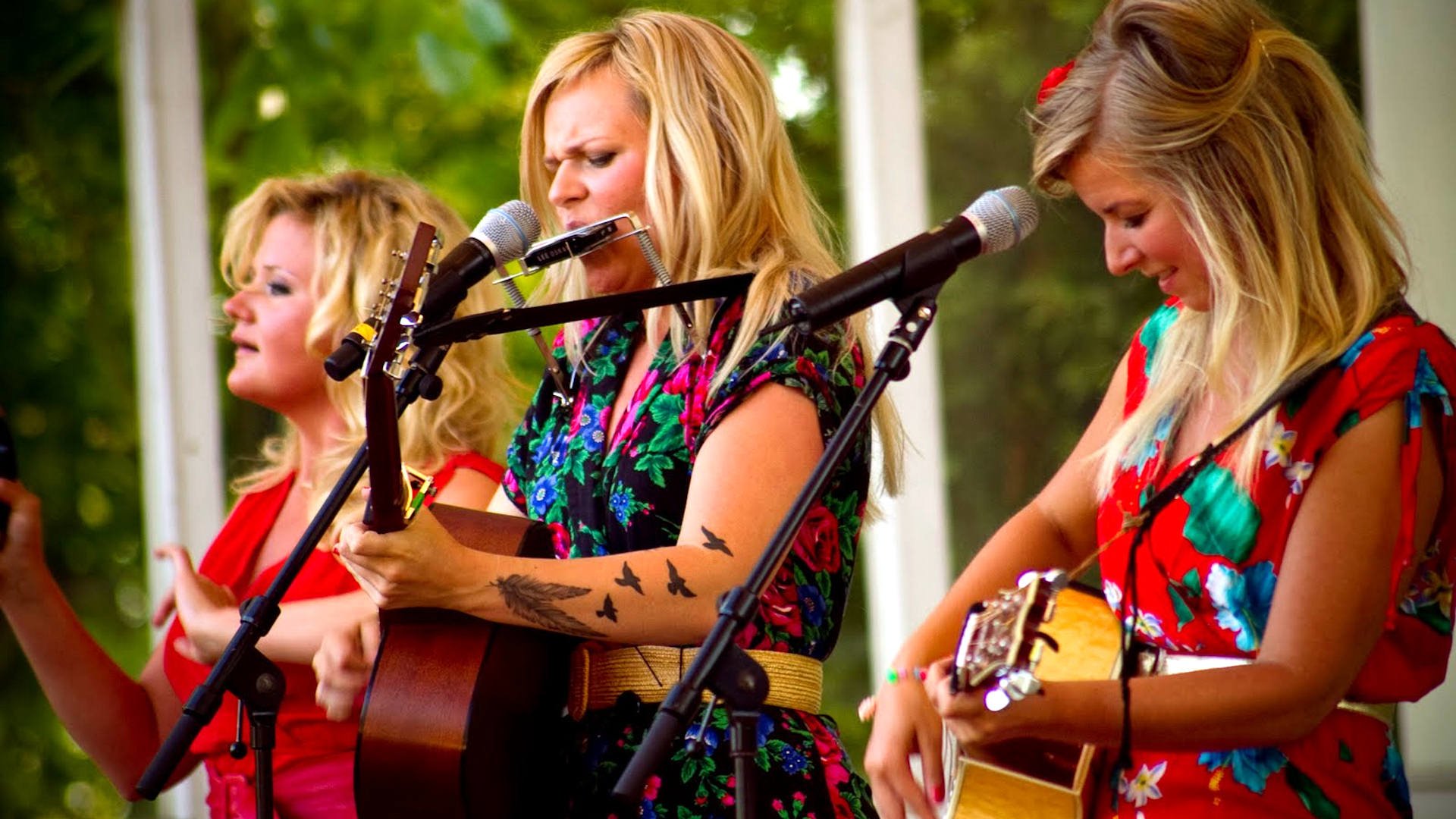Description: Three women singing into microphones while playing guitars and singing into microphones with trees in the background and a building in the background.