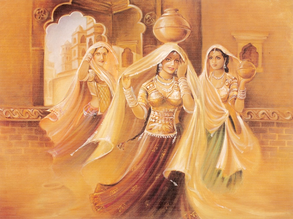 Description: A painting of three women dressed in traditional indian garb and holding pots of water and a pot of water.