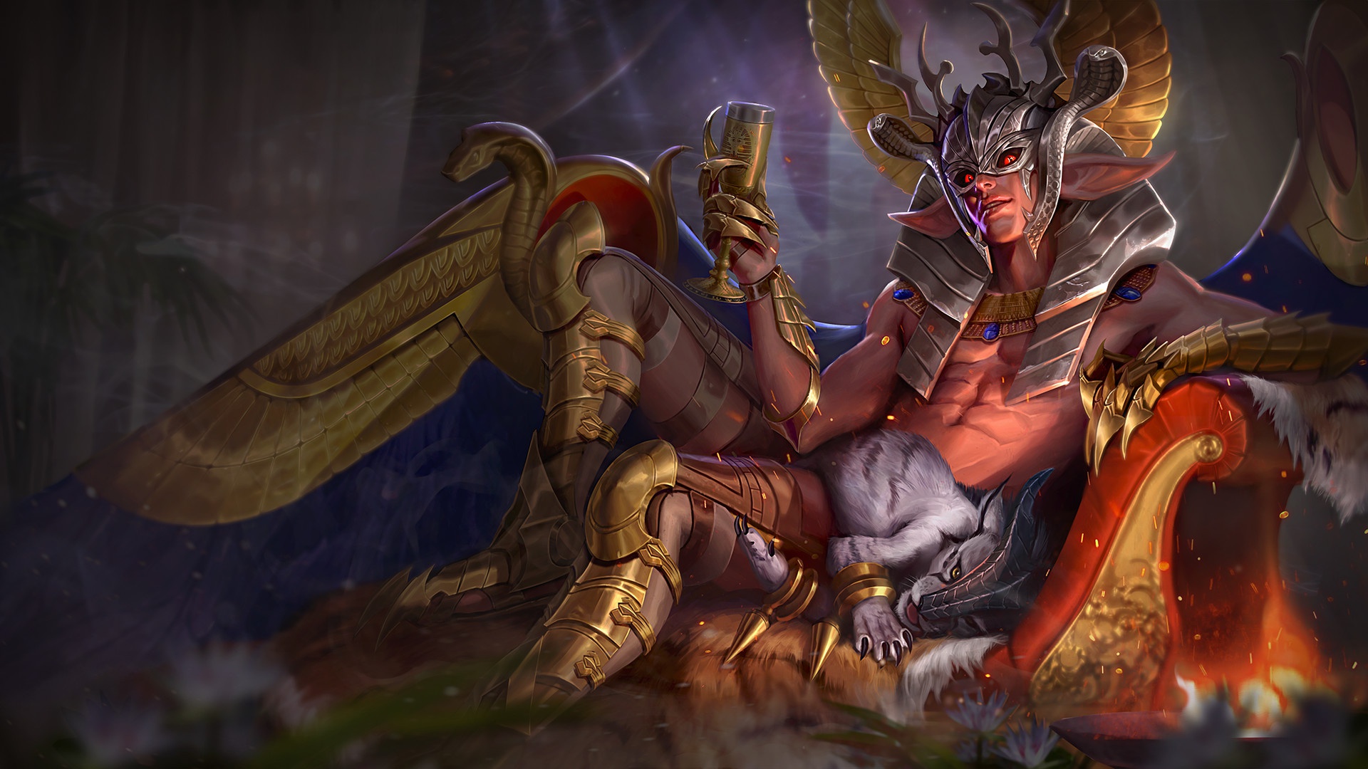 Description: A man sitting on a throne with a sword in his hand and a demon on his arm.