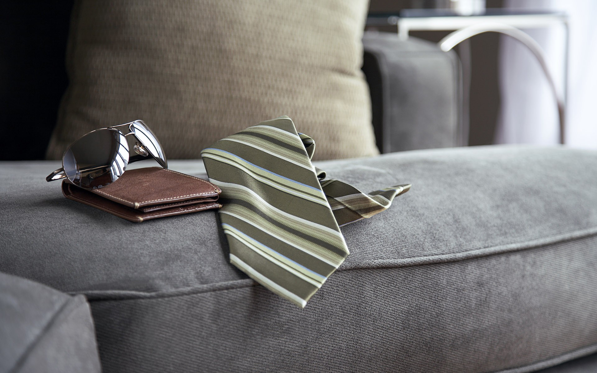 Description: A tie and wallet sitting on a couch next to a pillow and a pillow case on the couch with a pair of sunglasses.