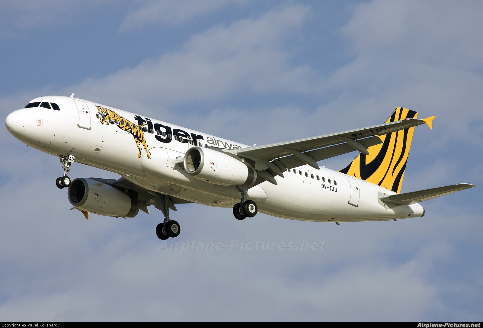 Description: A tiger airlines plane flying in the sky with its landing gear down and its wheels down and the tail end of the plane.
