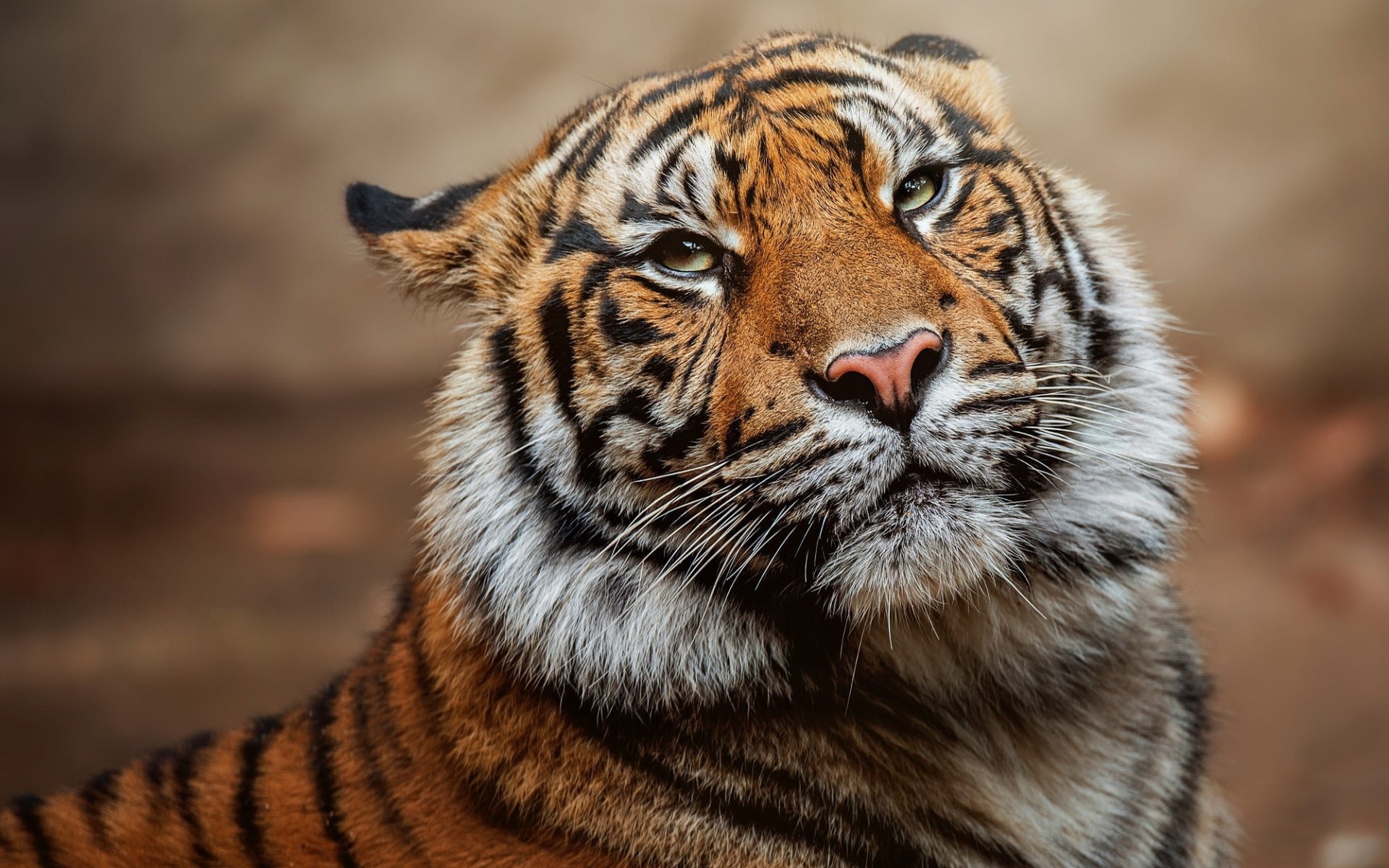 Description: A close up of a tiger looking at something in the distance with a blurry background of the image.
