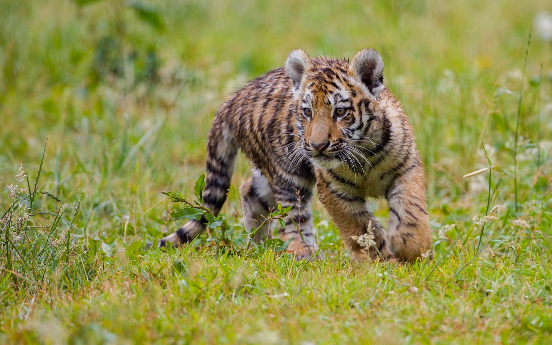 Description: A small tiger cub running through a grassy field with its mouth open and tongue out.