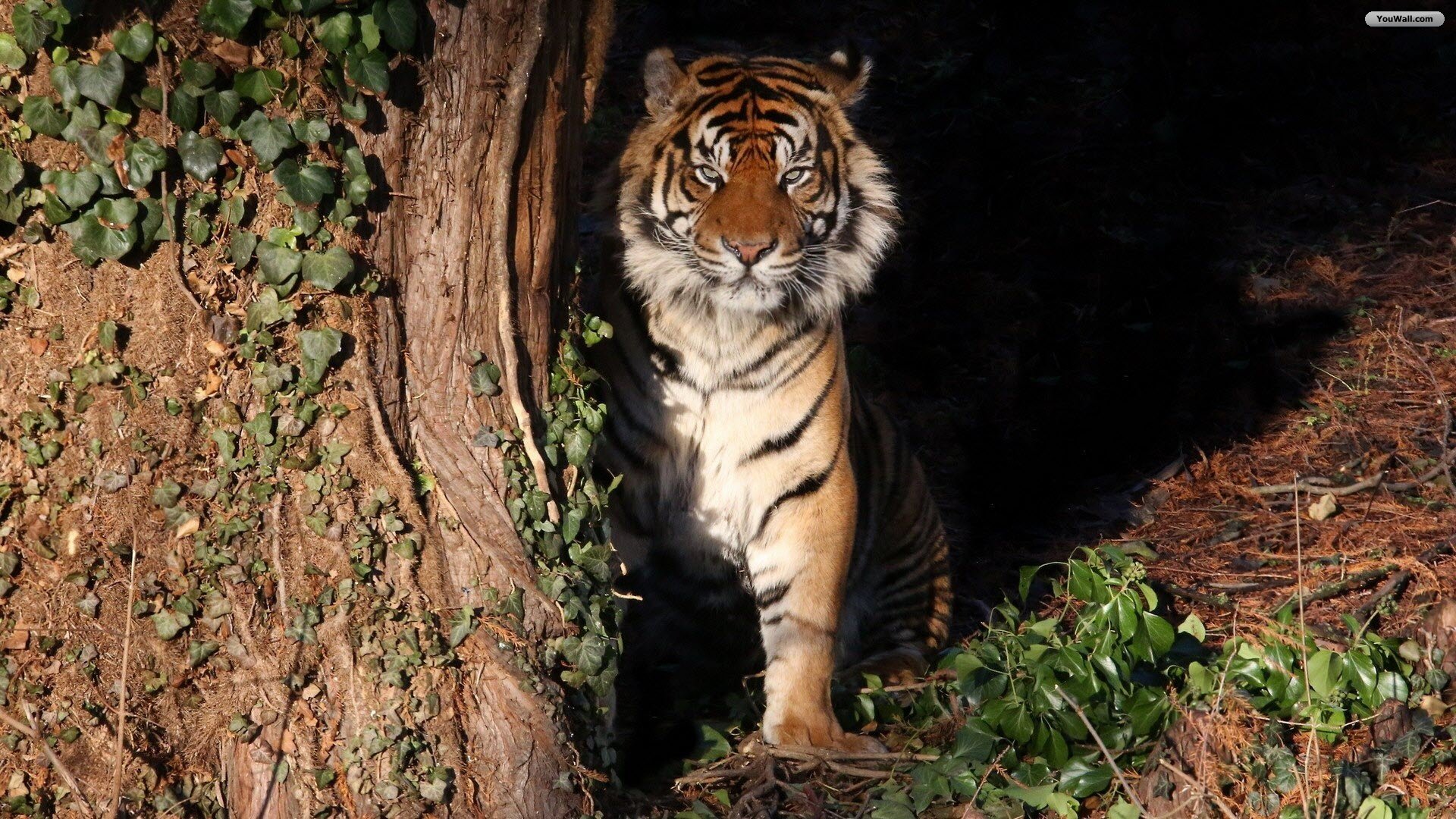 Description: A tiger is standing in the dark near a tree trunk and bushes and a bushy area with a small tree.