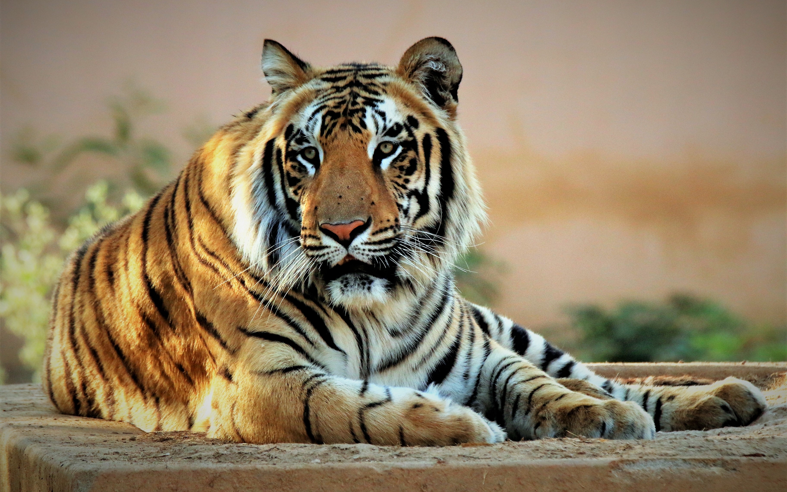 Description: A tiger laying down on a cement slab in a zoo enclosure with a plant in the background and a wall in the background.