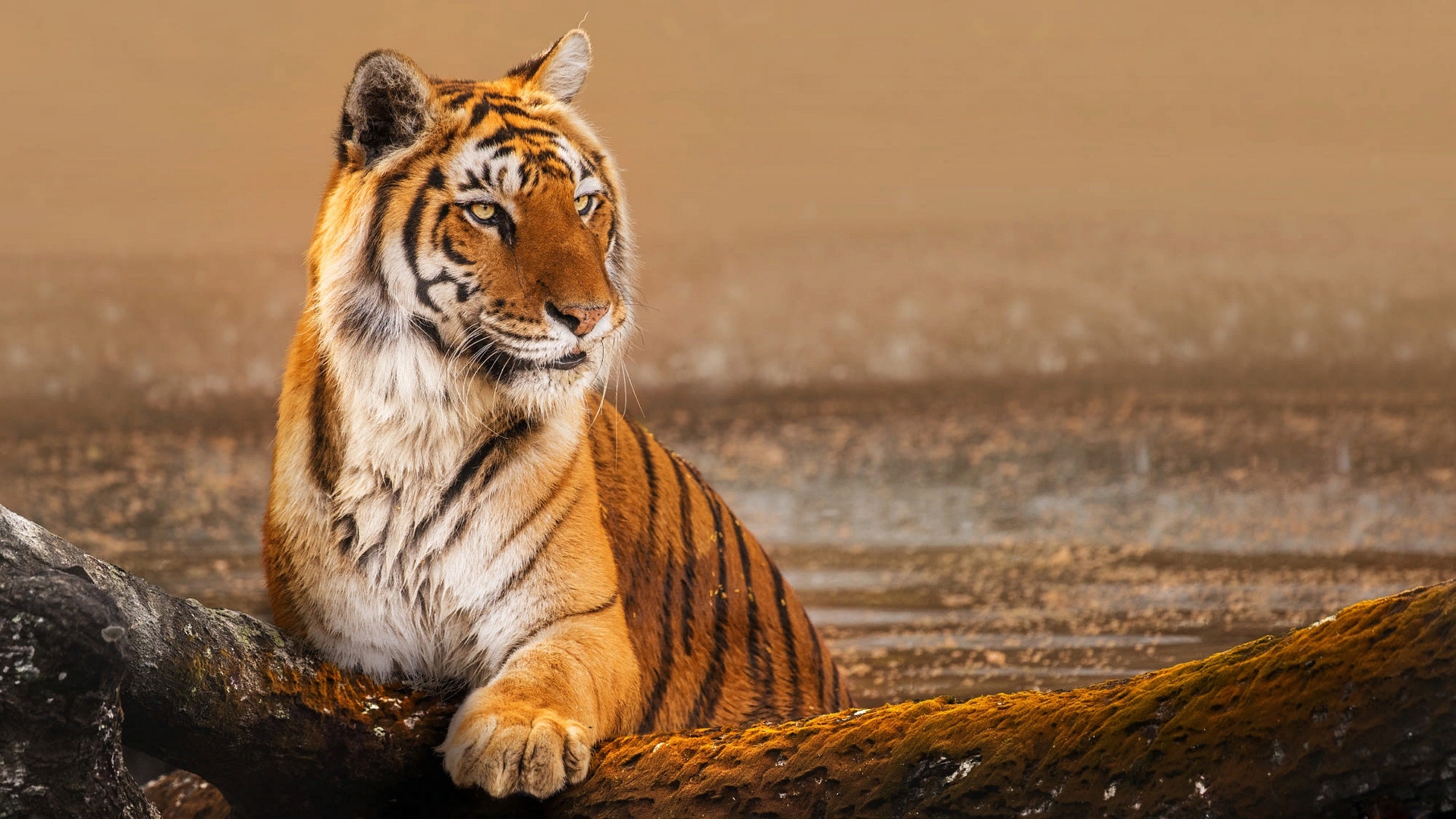 Description: A tiger sitting on a log in the water looking at something in the distance with a blurry background.