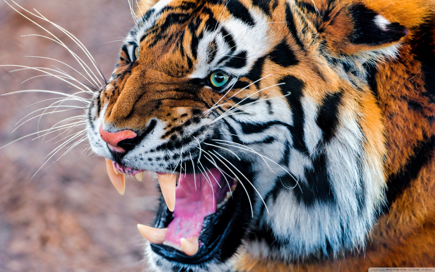 Description: A tiger with its mouth open and it's teeth wide open and it's mouth is open.