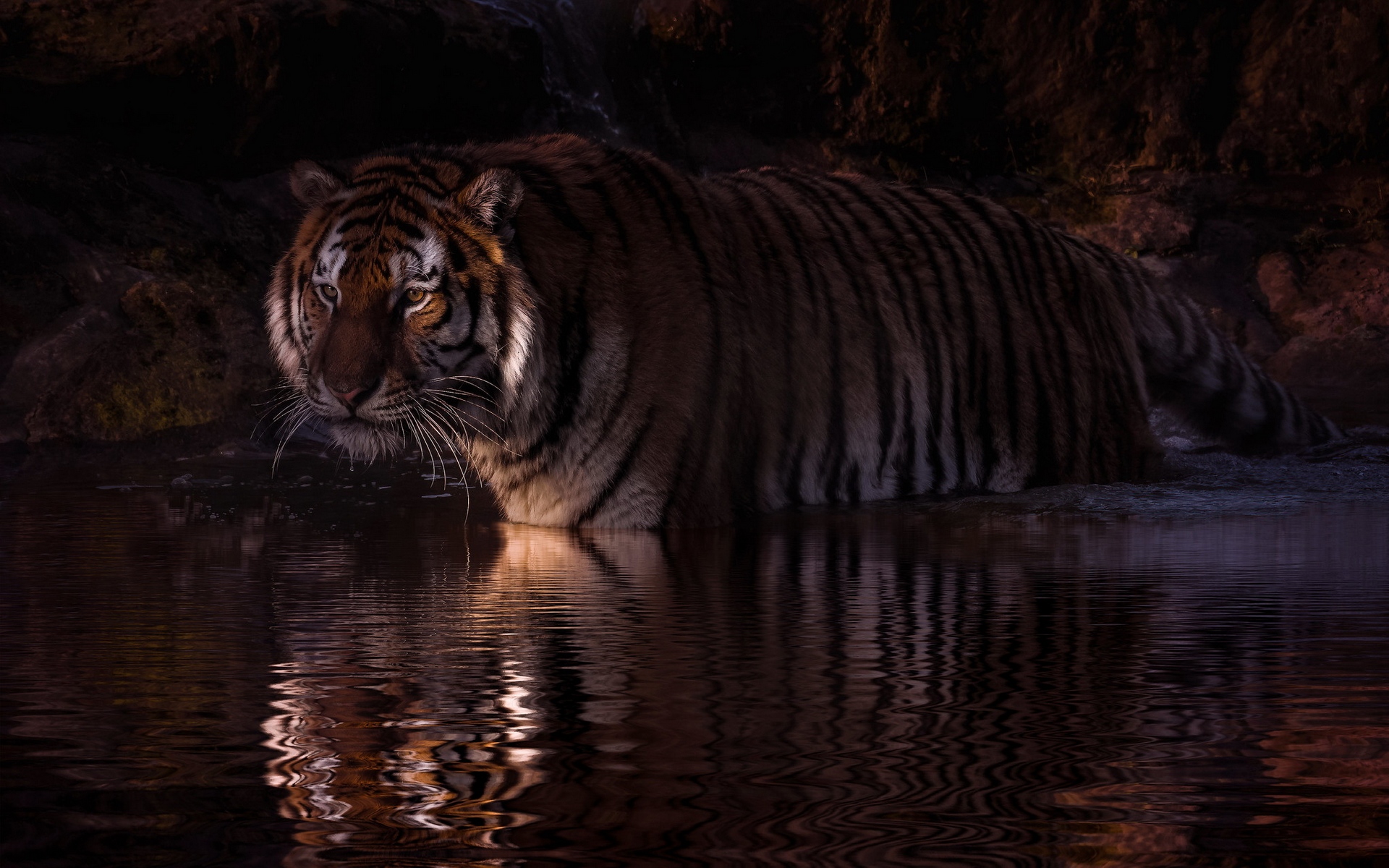 Description: A tiger is standing in the water at night time.
