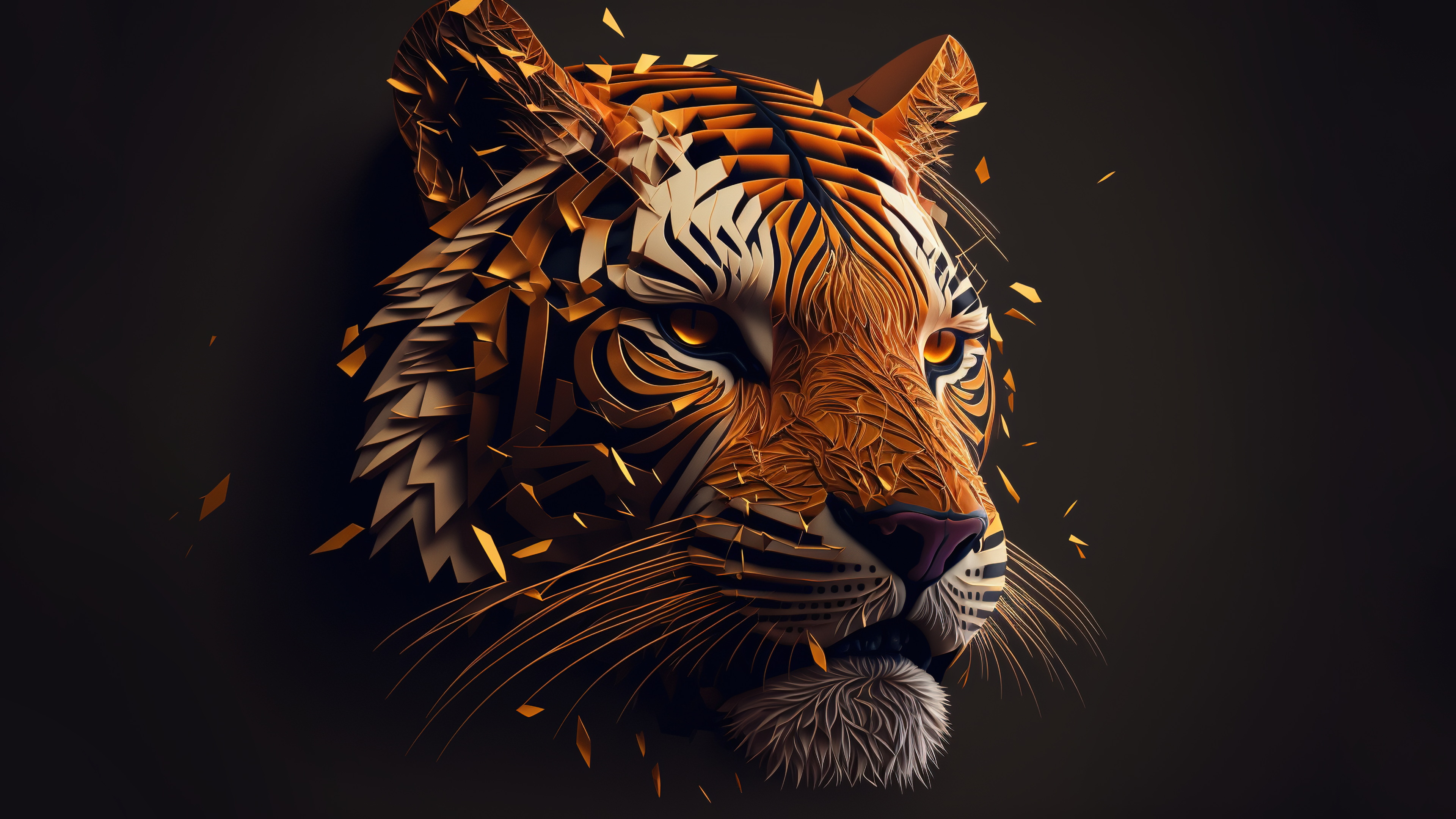 Description: A tiger head made out of paper with a black background and gold foiling on it's face.