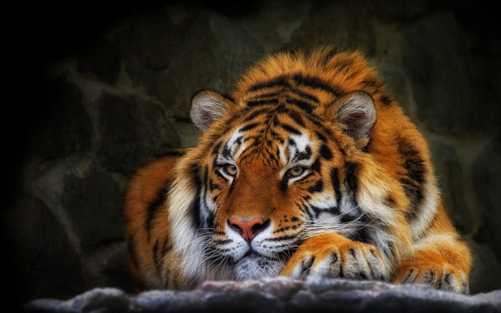 Description: A tiger laying down on a rock in the dark with its eyes closed and one paw resting on the ground.