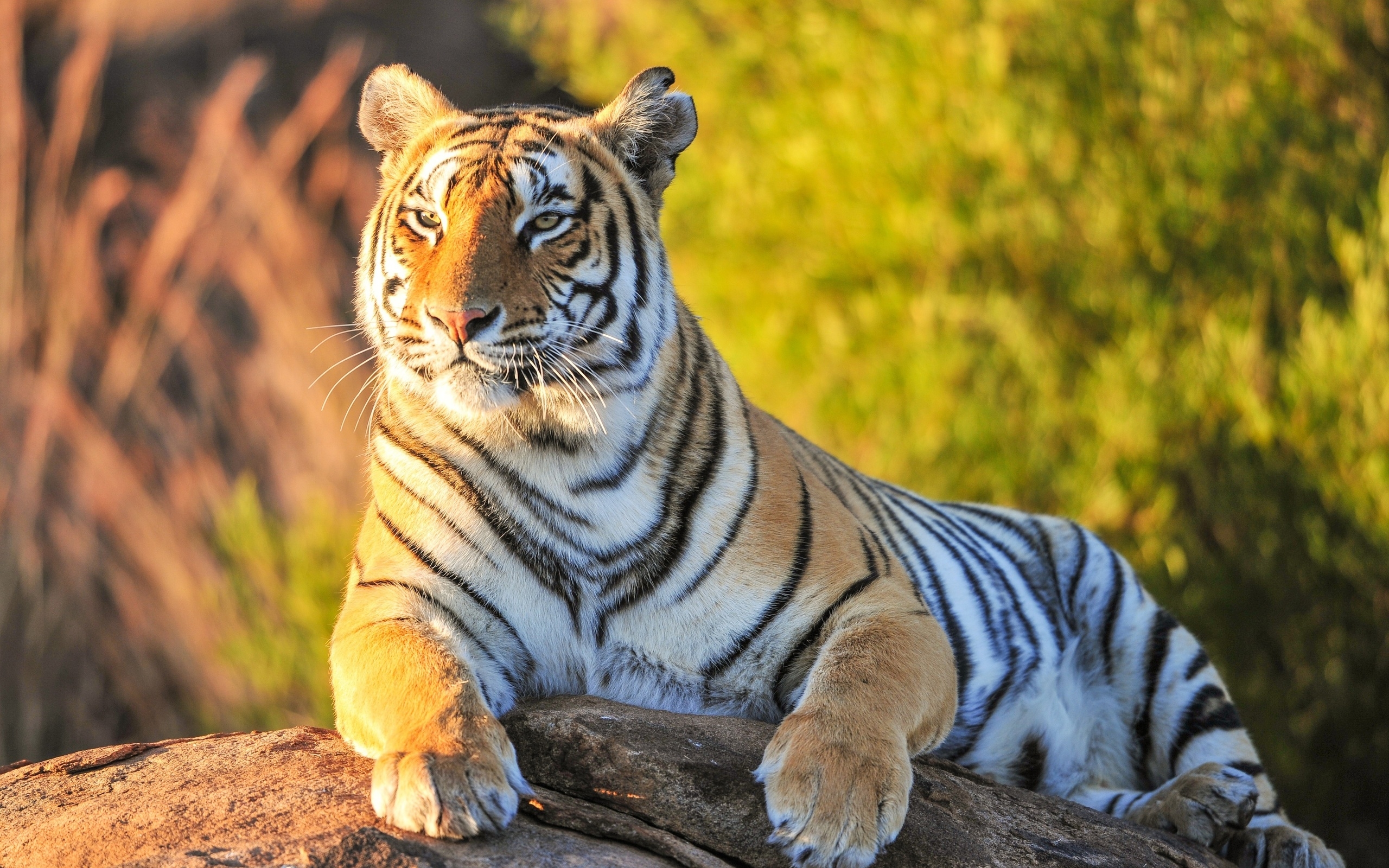 Description: A tiger laying on a rock in the sun with a blurry background of grass and bushes in the background.