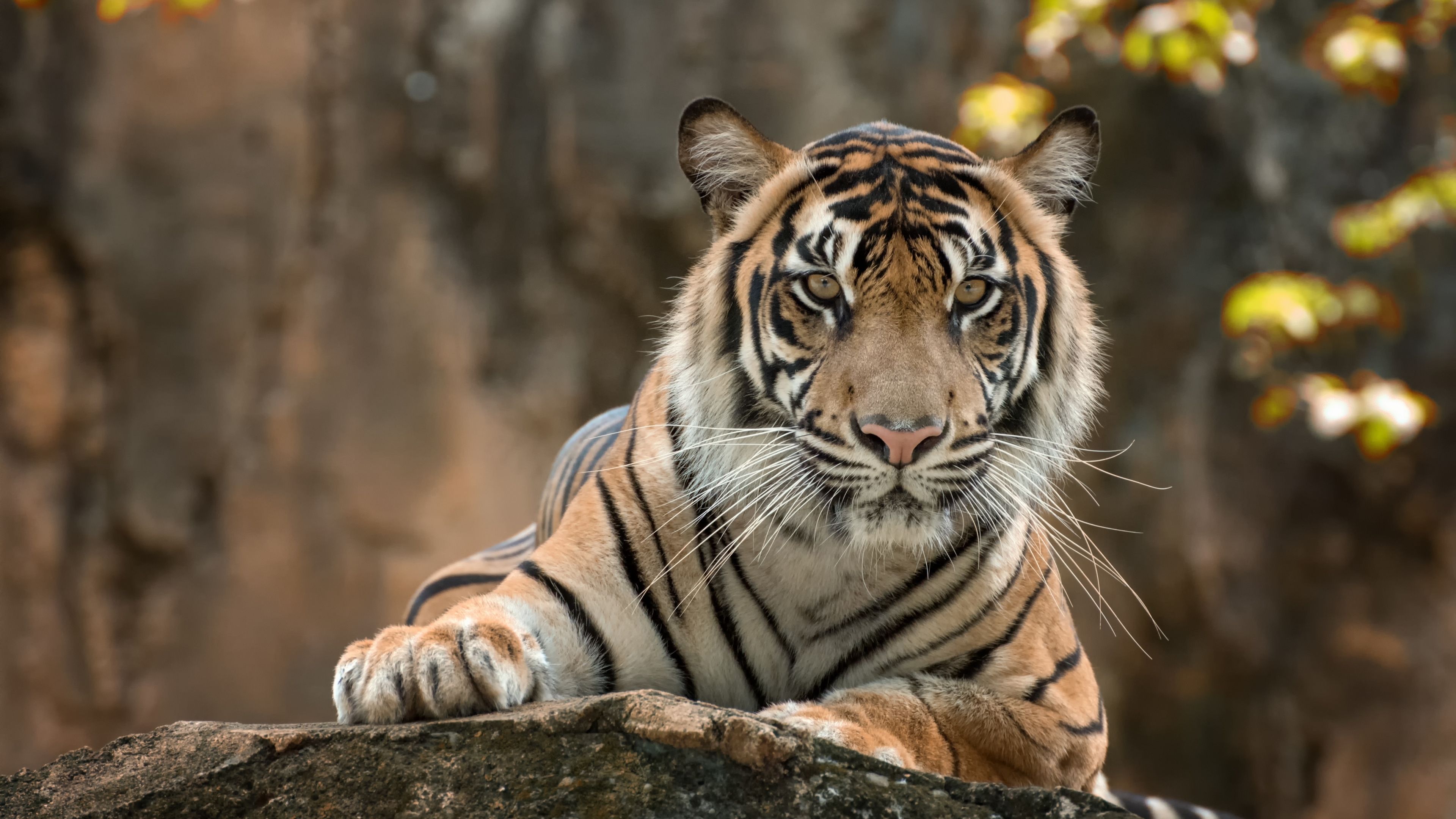 Description: A tiger laying on a rock in a zoo enclosure with a tree in the background and a rock wall.
