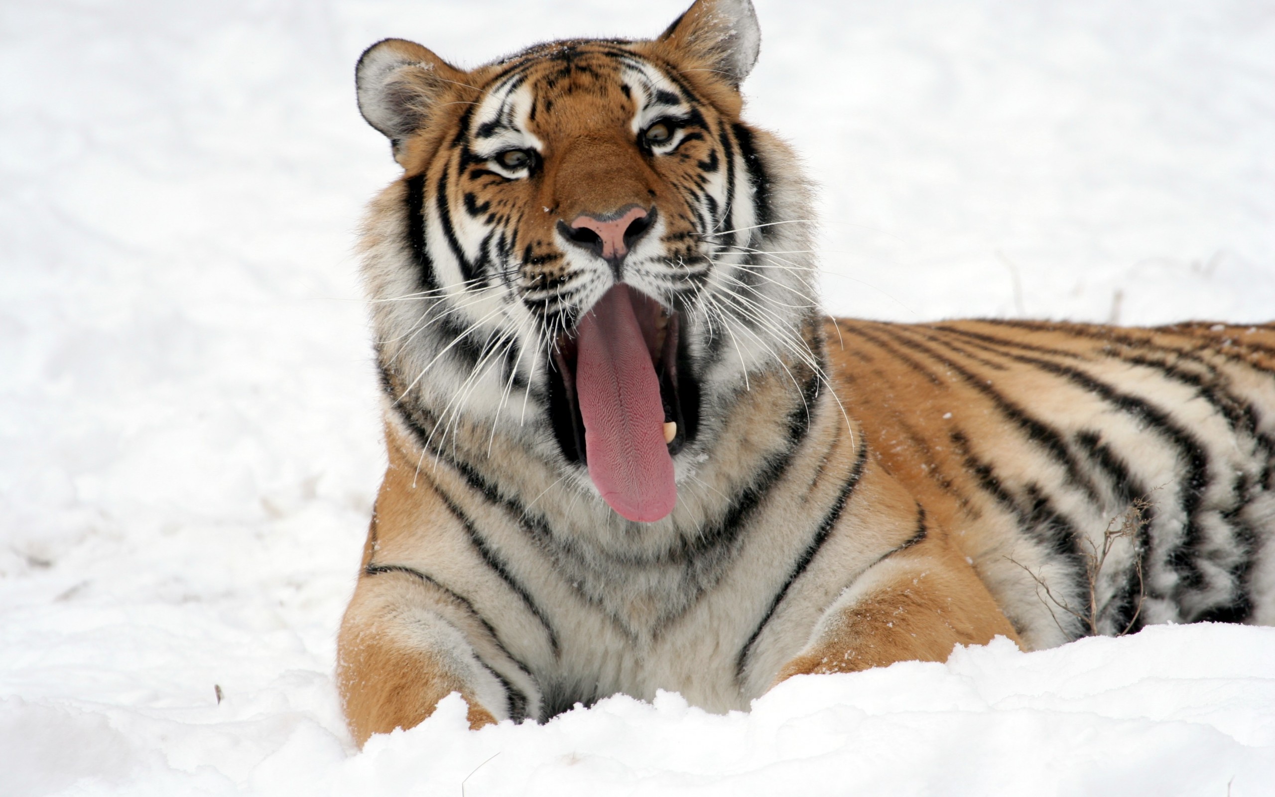 Description: A tiger laying in the snow yawning and yawning with its mouth open and tongue out.