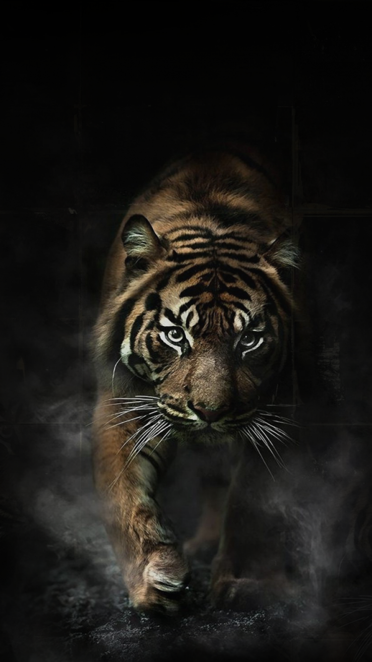 Description: A tiger walking through the dark with smoke coming out of its mouth and eyes.
