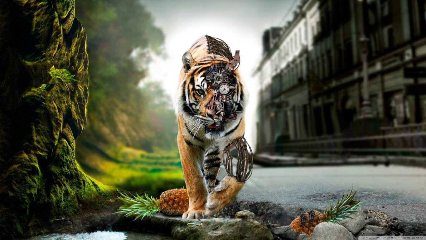 Description: A tiger is walking on a rock in the middle of a forest with a building in the background and a pond in the foreground.