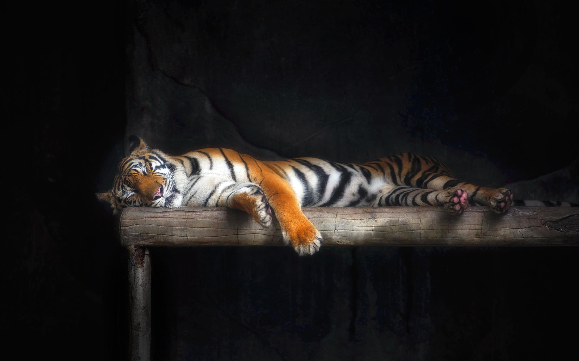 Description: A tiger laying on a wooden ledge in the dark with its eyes closed and tongue out.