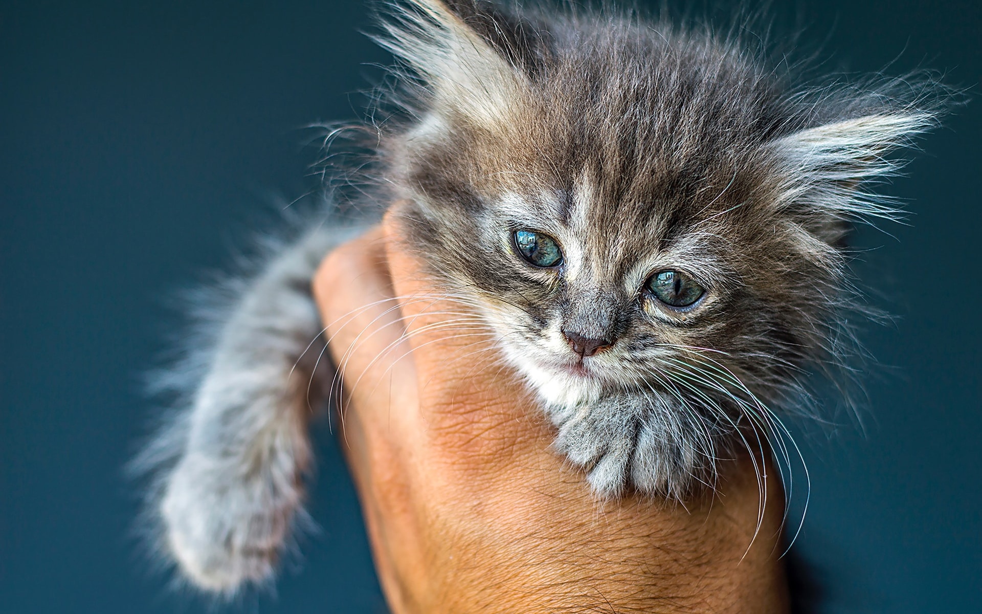 Description: A small kitten is being held by a person's hand with a blue background and a blue background.