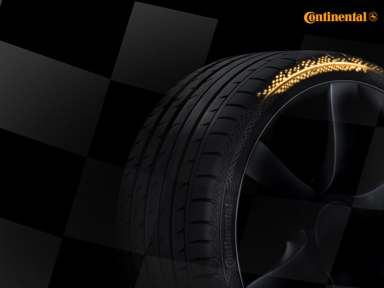 Description: A tire with a yellow light on it on a black background with a checkered pattern and a checkered background.