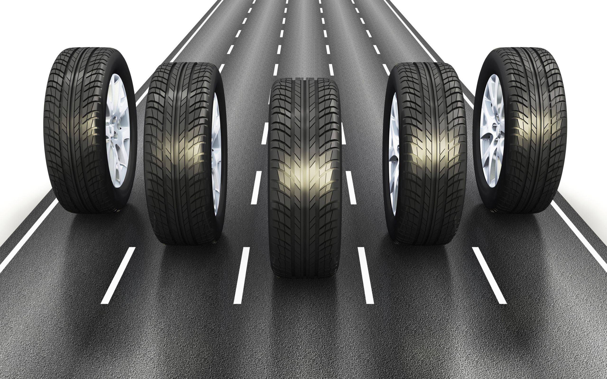 Description: A row of tires on a road with a white background and a white line of the road with white markings.