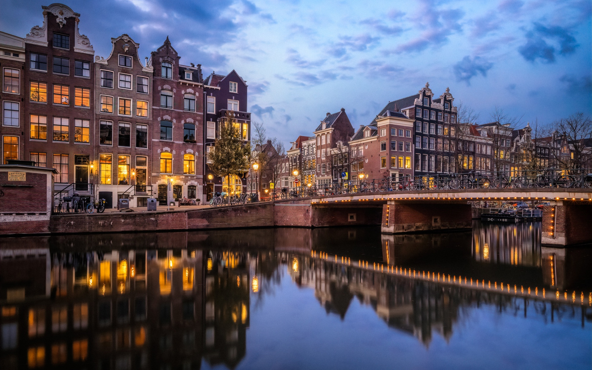 Description: A bridge over a river with buildings on both sides of it at night time with lights on the buildings.