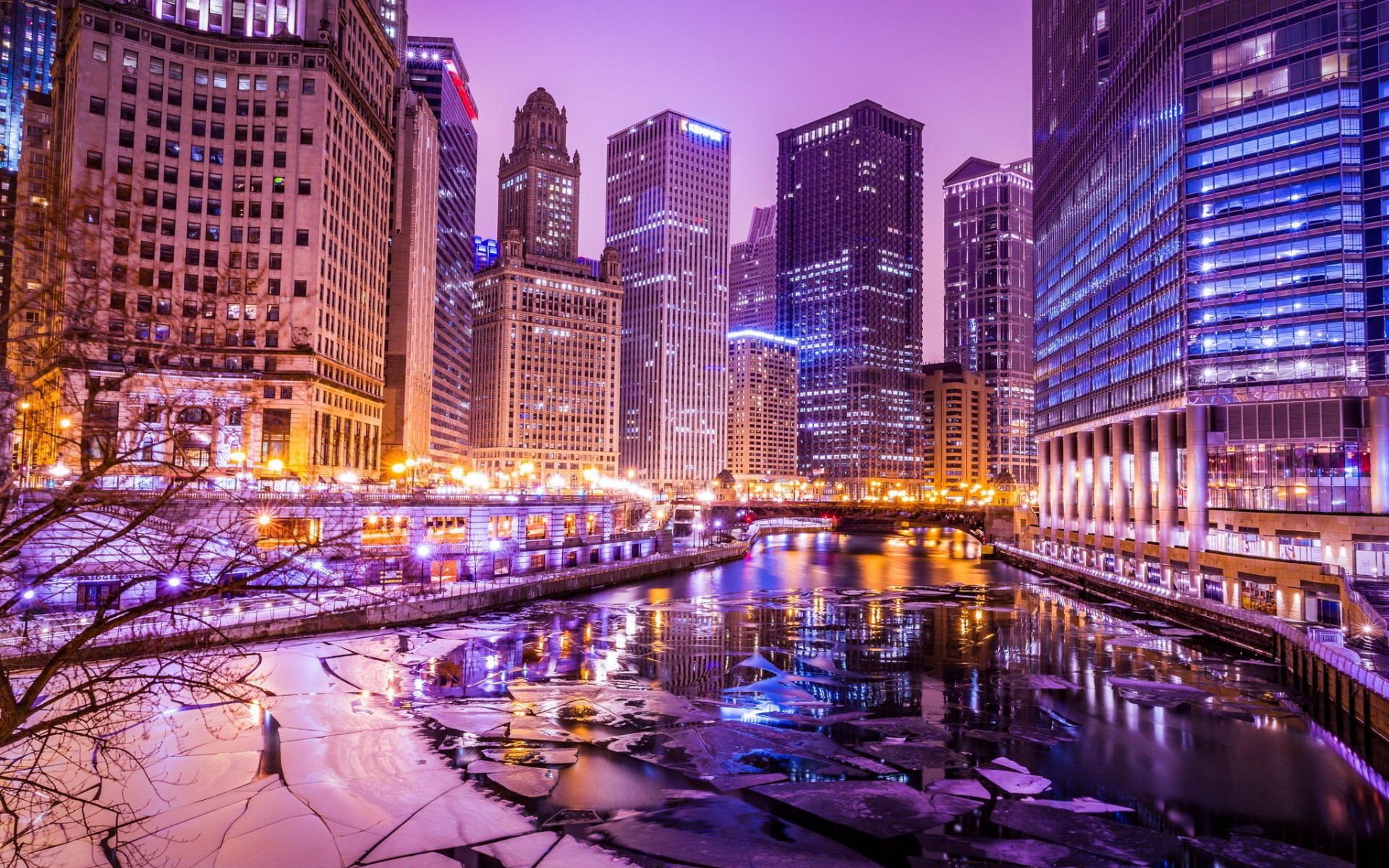 Description: A city with a river and a bridge at night time with lights on the buildings and snow on the ground.
