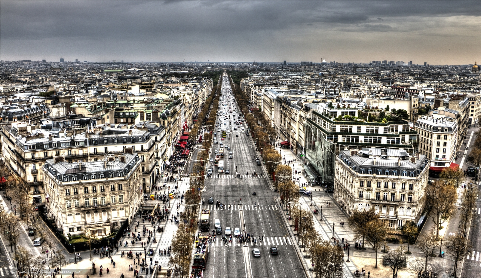 Description: A view of a city with a lot of buildings and cars on the street and a cloudy sky above.