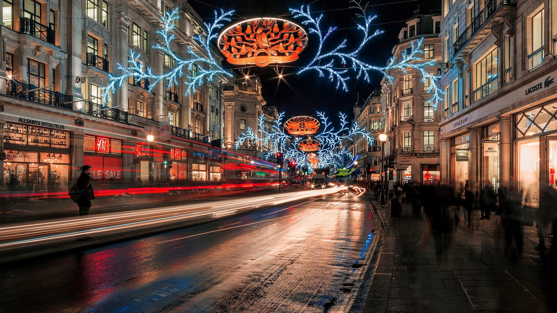 Description: A city street with a clock and christmas lights on it's sides and people walking on the sidewalk.