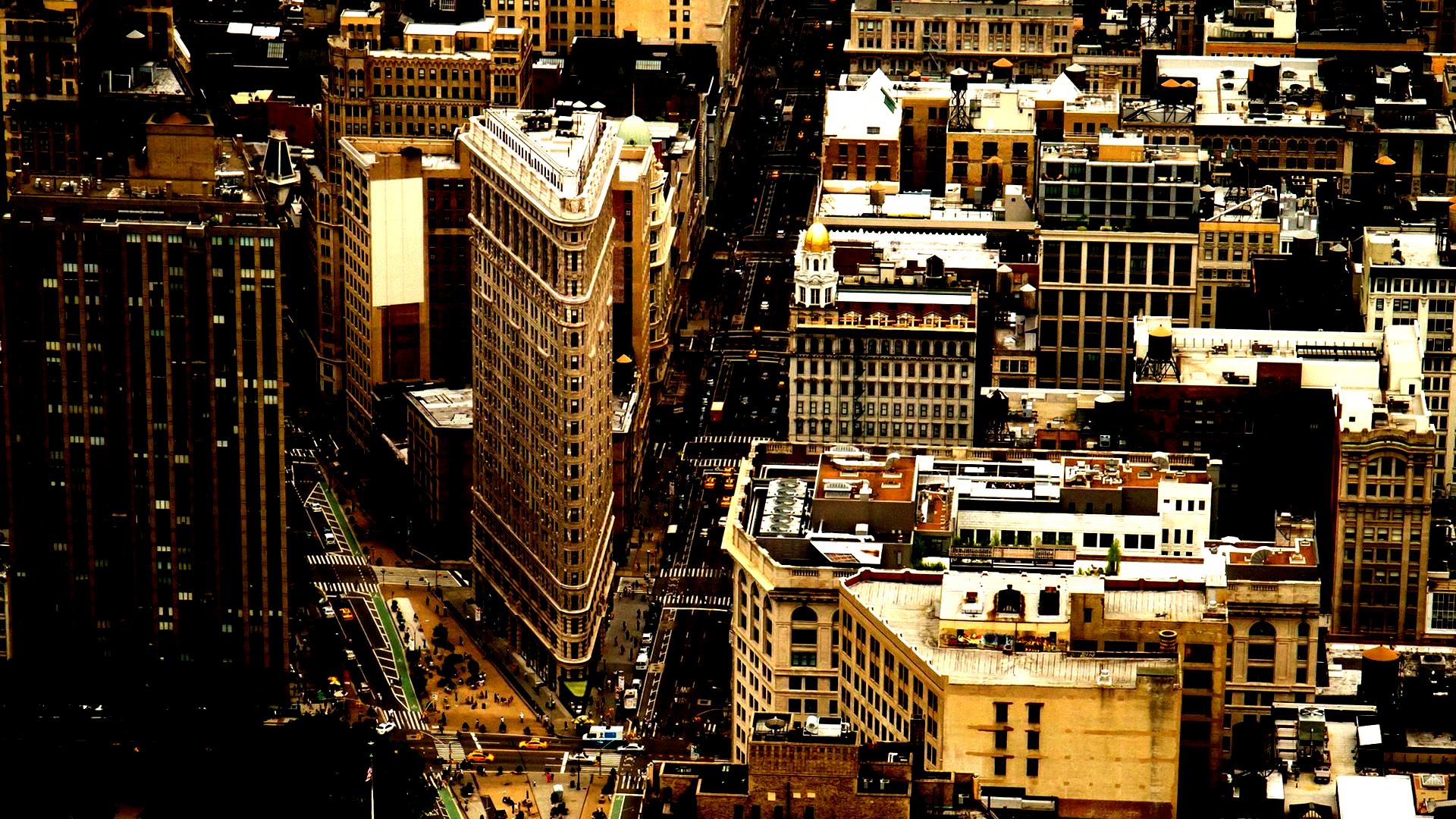 Description: A city with tall buildings and a street in the middle of it with a traffic light on top of it.