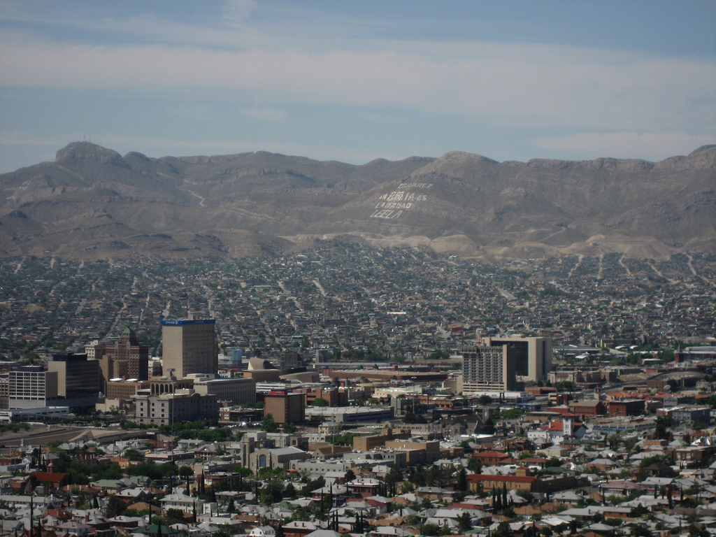 Description: A city with mountains in the background and a sky line in the foreground with a few clouds in the sky.