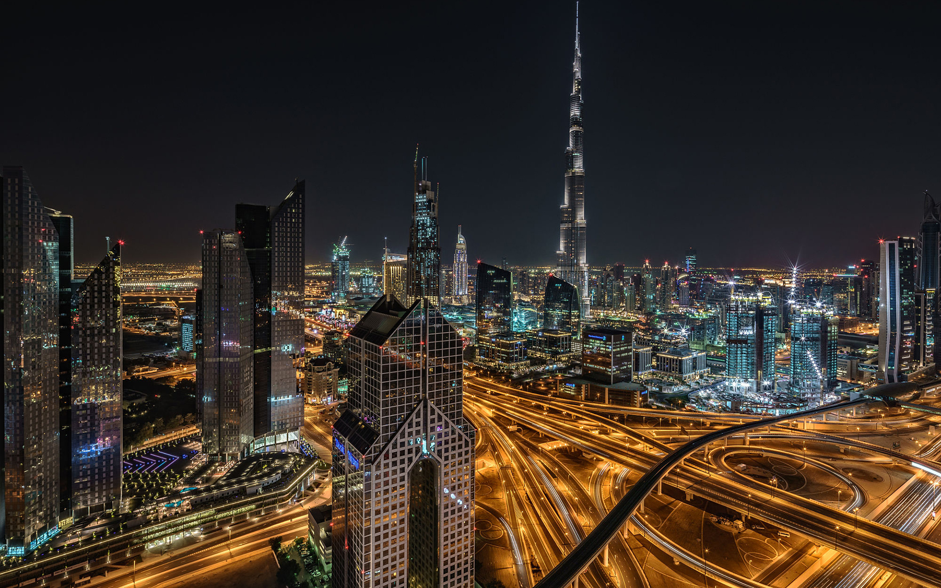 Description: A city skyline at night with a lot of lights and buildings in the background and a highway in the foreground.