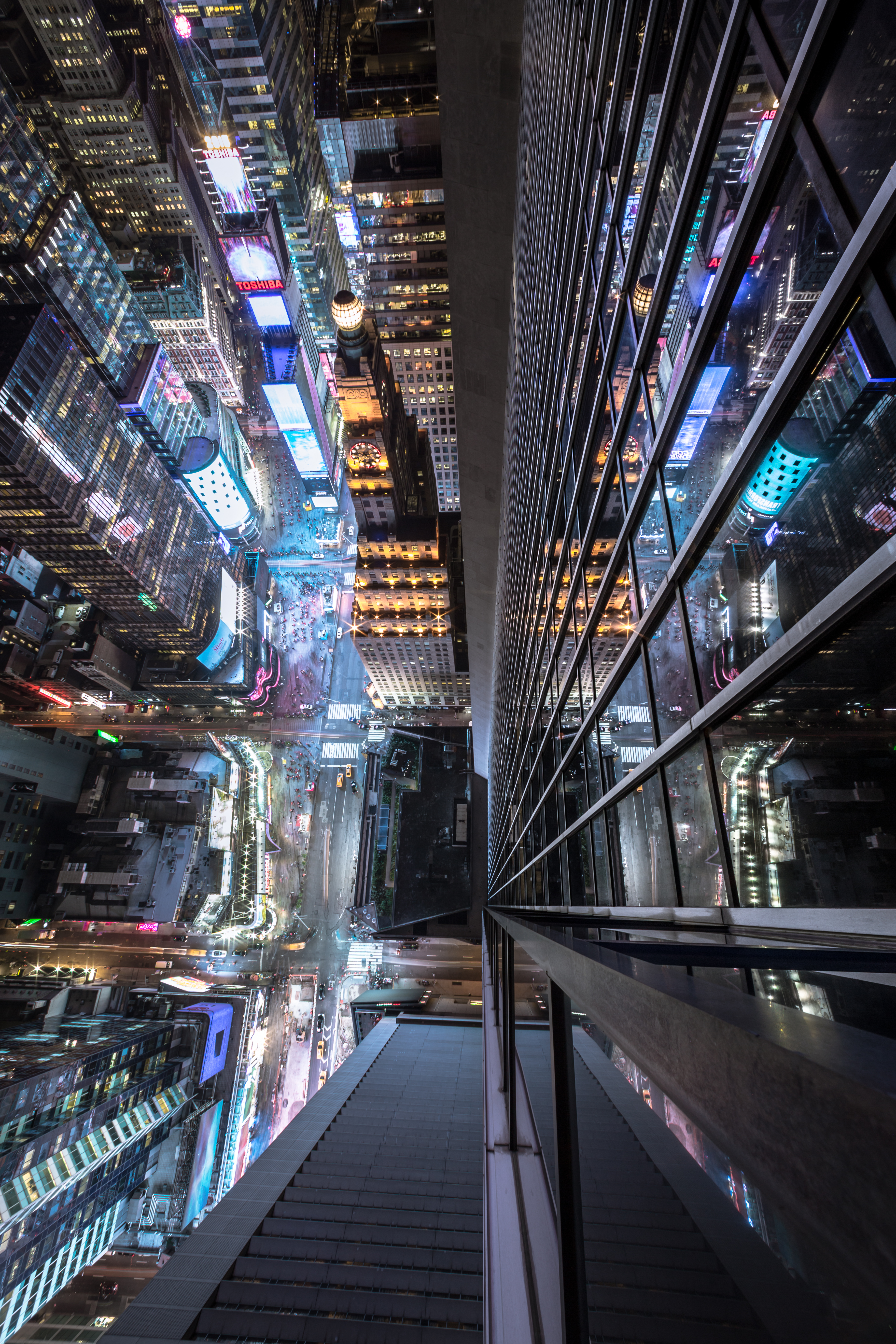 Description: A cityscape with a lot of tall buildings and lights at night time.