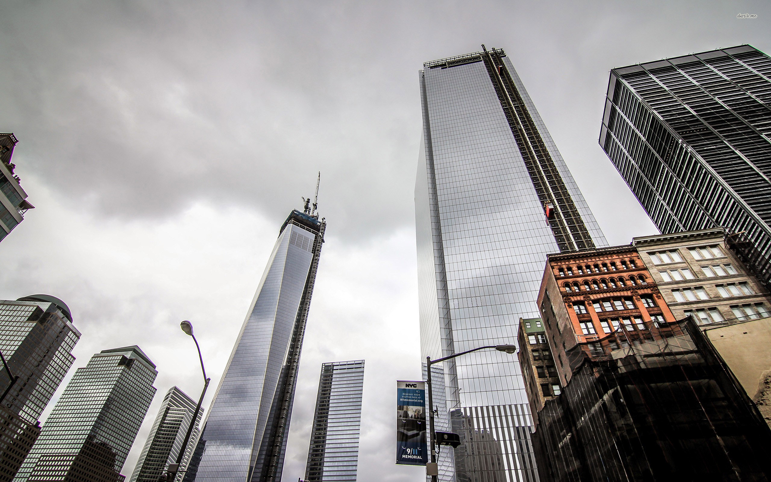 Description: A city street with tall buildings and a traffic light in the foreground and a cloudy sky in the background.