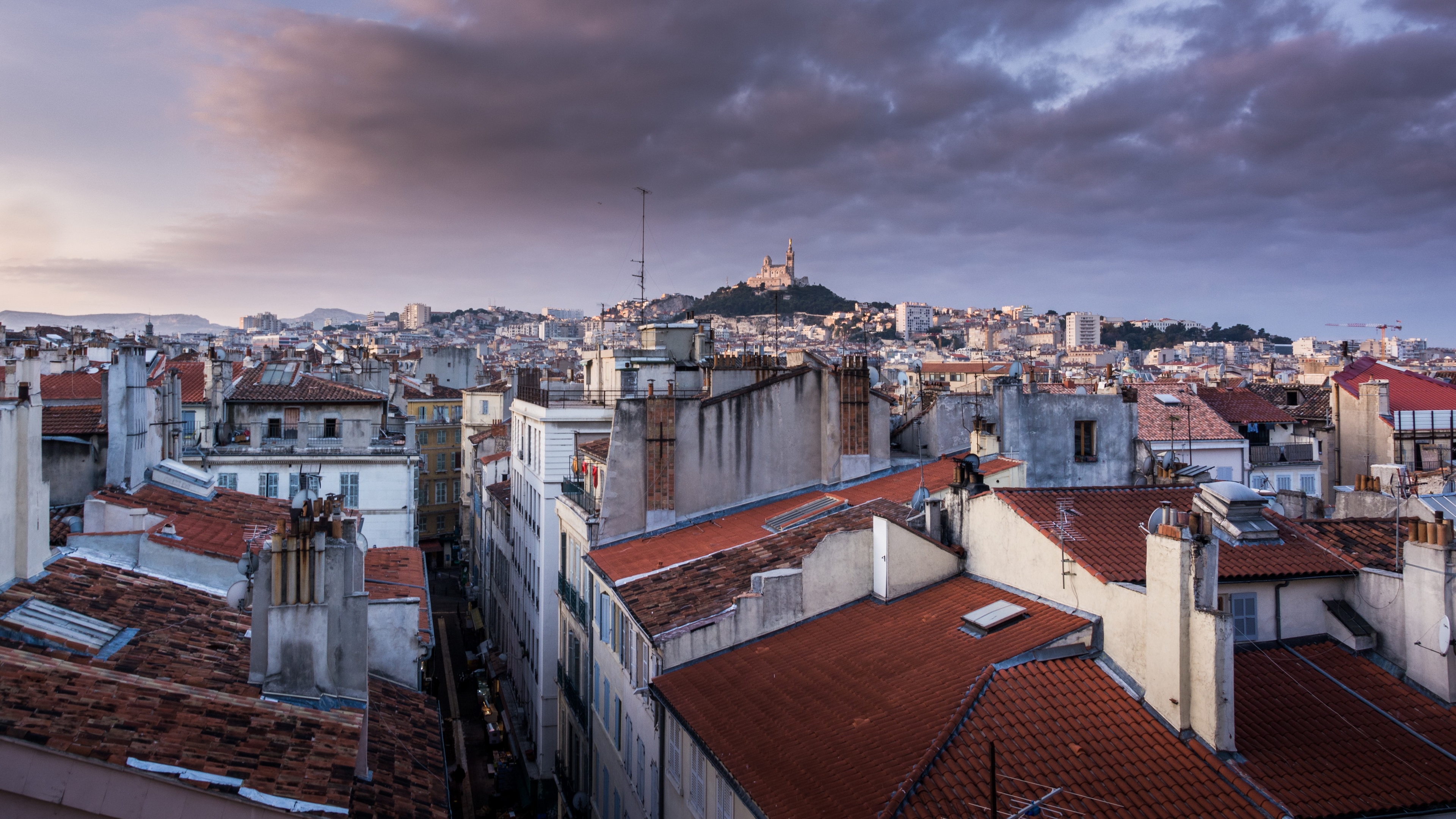 Description: A cityscape with a cloudy sky and a few buildings in the foreground and a hill in the background.