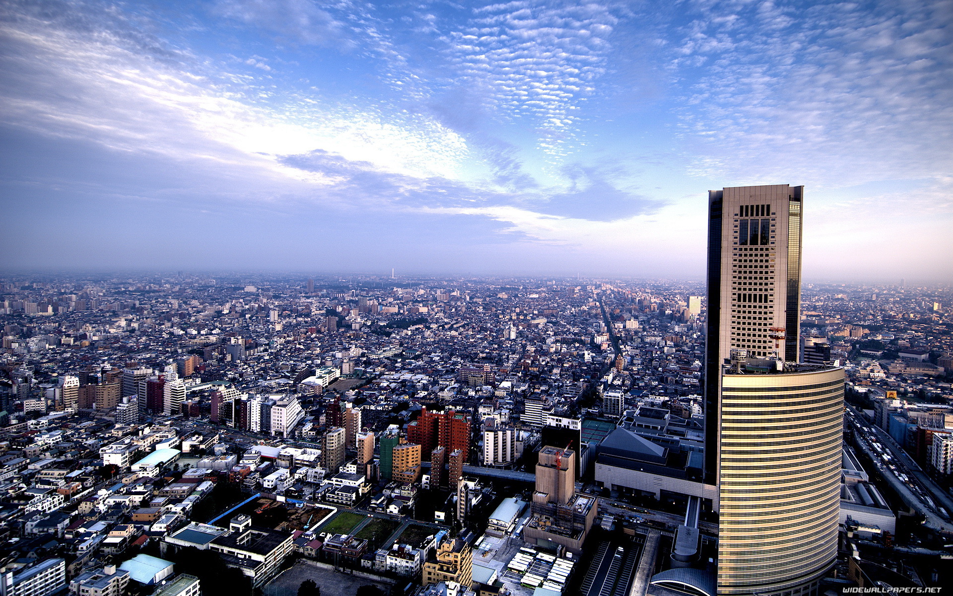 Description: A cityscape with a very tall building in the middle of it and a blue sky with clouds.