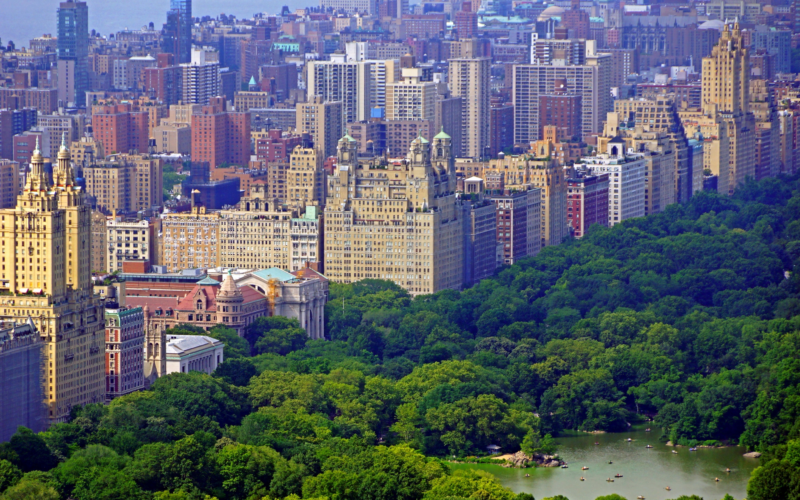 Description: A city with lots of tall buildings and trees in the foreground and a lake in the middle of the city.