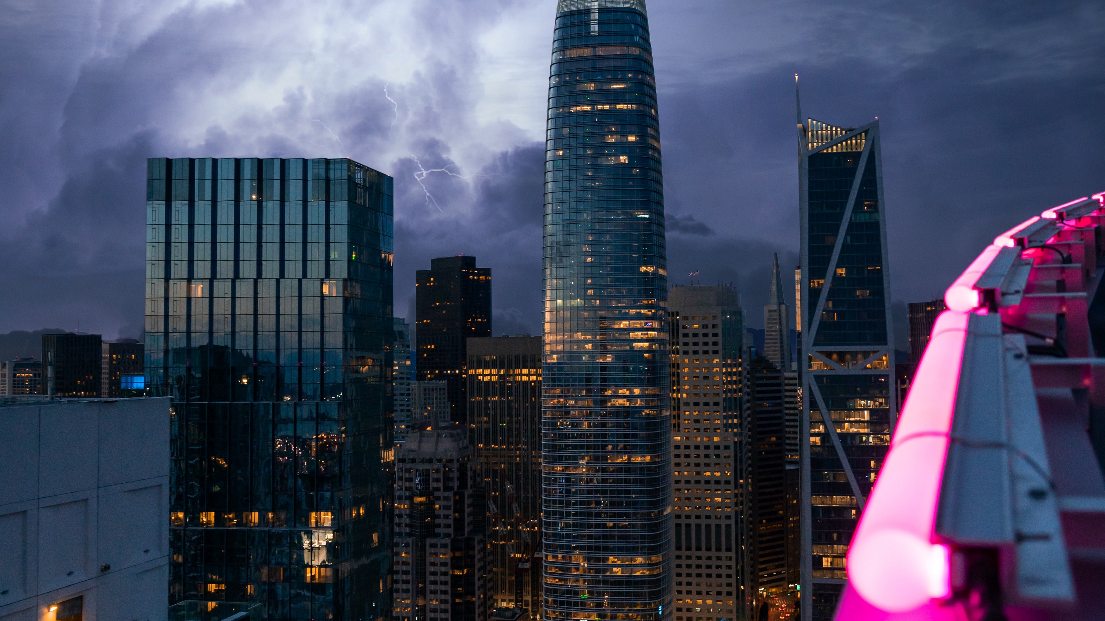 Description: A city skyline with a lightning bolt in the sky and a pink light on the building and the sky.