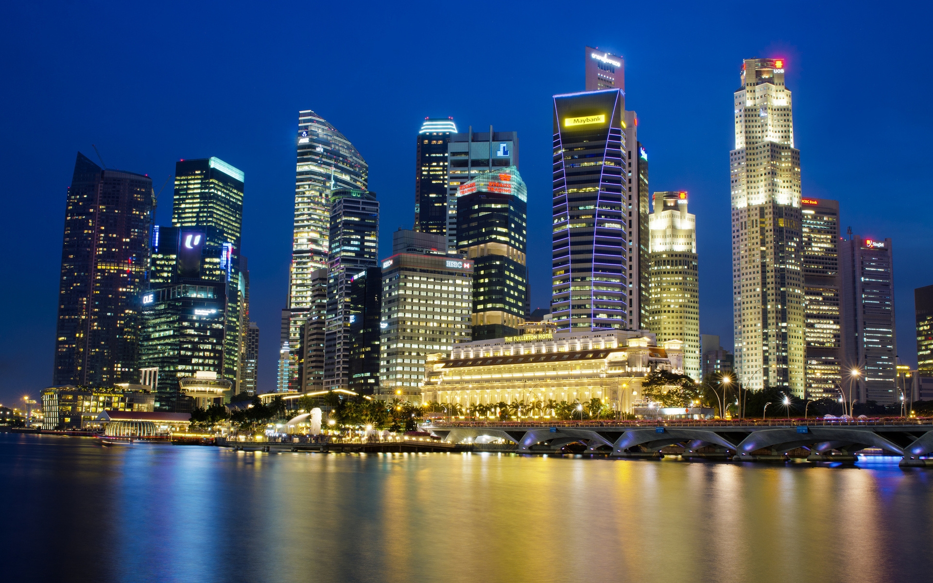 Description: A city skyline at night with a bridge and a river running through it and lit up with lights and reflections.