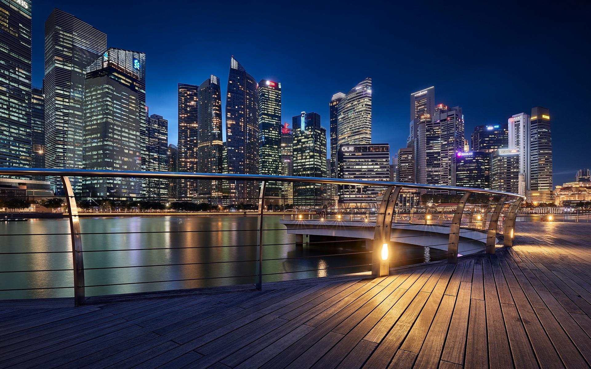 Description: A city skyline at night with a bridge and a river running through it and a lit up bridge in the foreground.