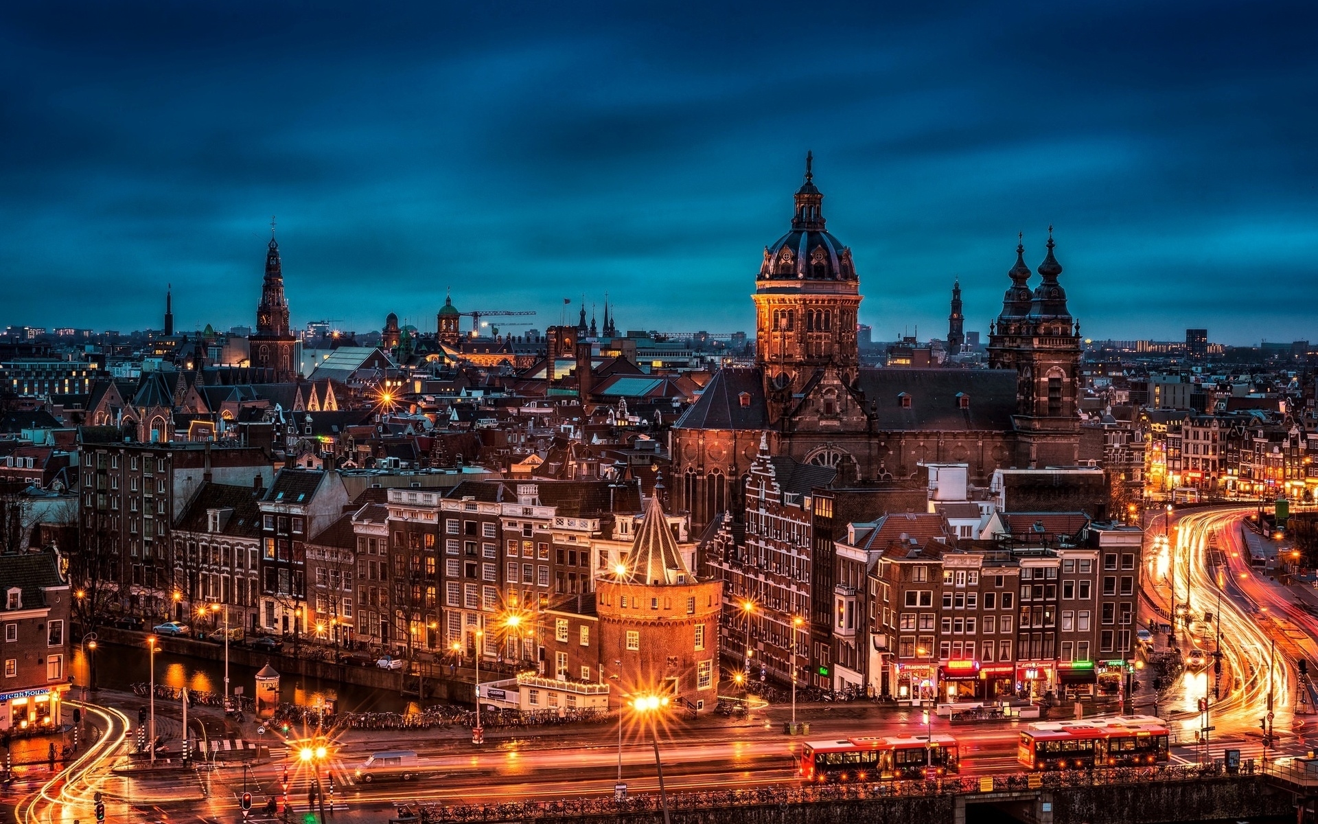 Description: A city with a lot of tall buildings and a bridge over it at night time with traffic going by.