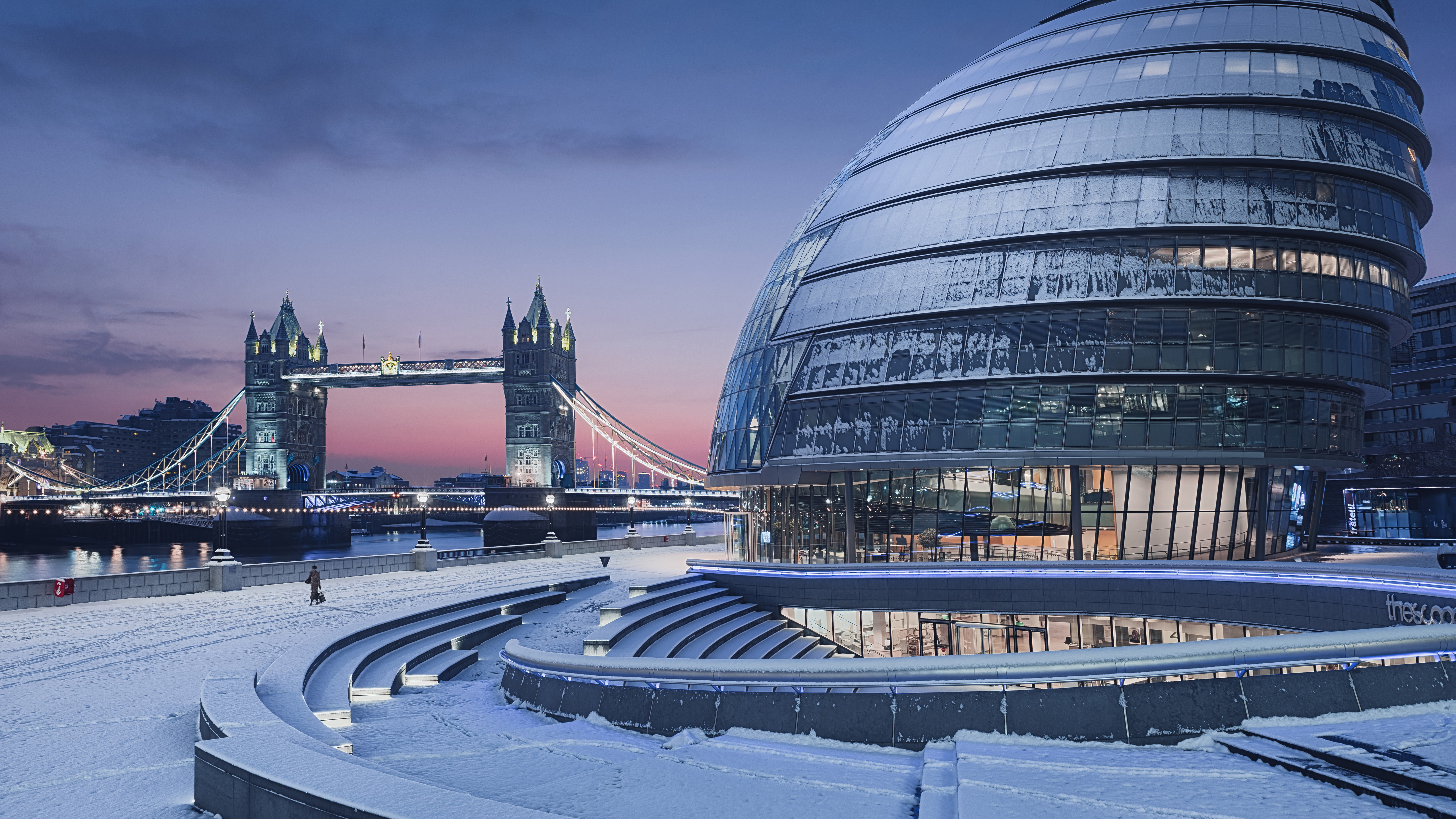 Description: A building with a tower and a bridge in the background at dusk with snow on the ground and a person walking in the foreground.