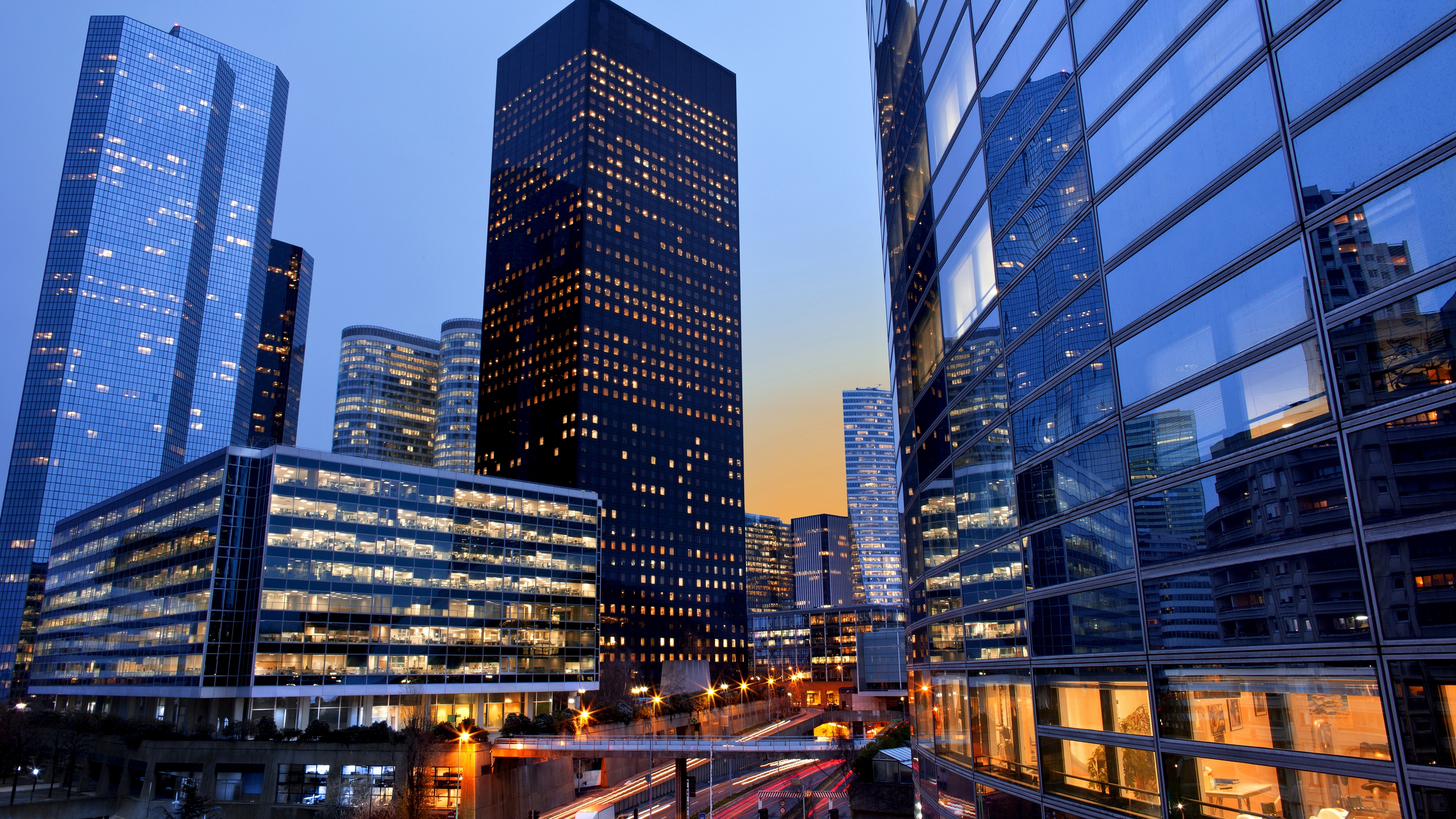 Description: A city skyline with skyscrapers and a street at night time with lights on and a bus passing by.