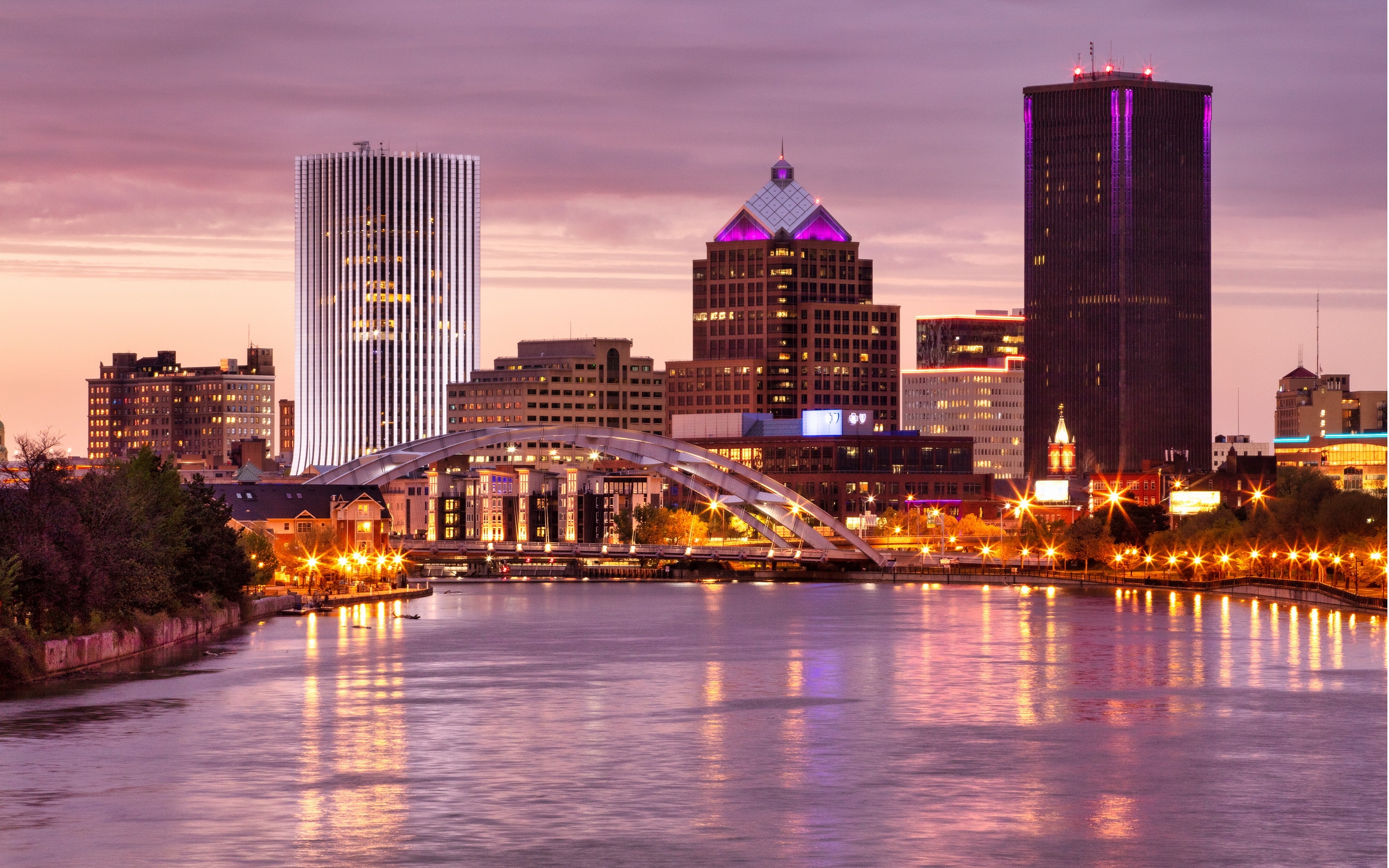 Description: A city skyline with a river running through it at dusk with lights on the buildings and a bridge in the foreground.