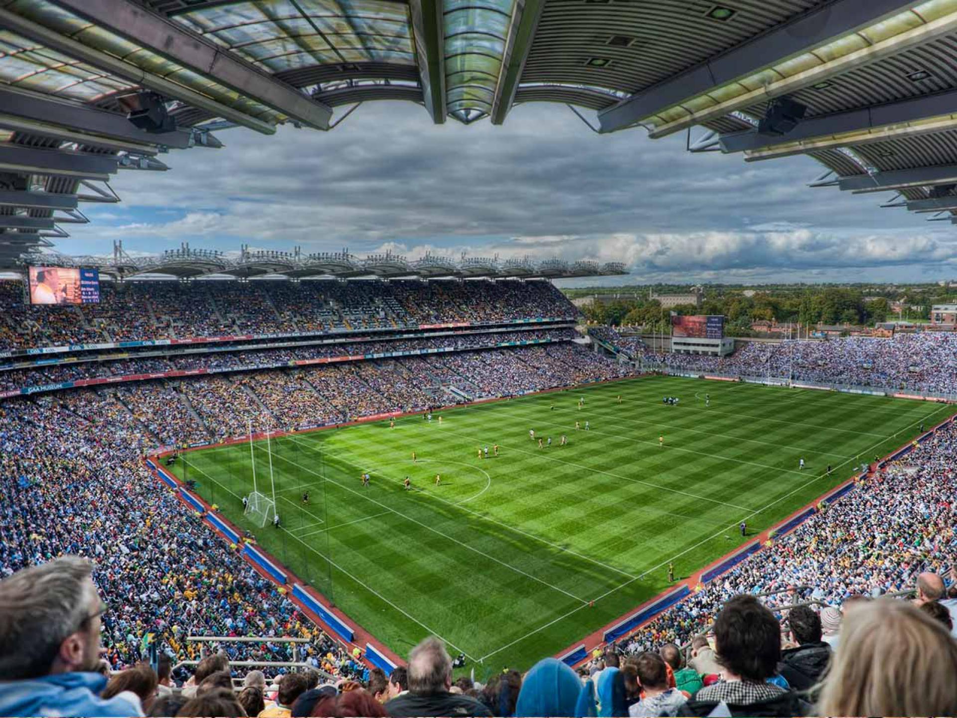 Description: A large stadium filled with people watching a soccer game on a cloudy day with a sky background and a large crowd of people.